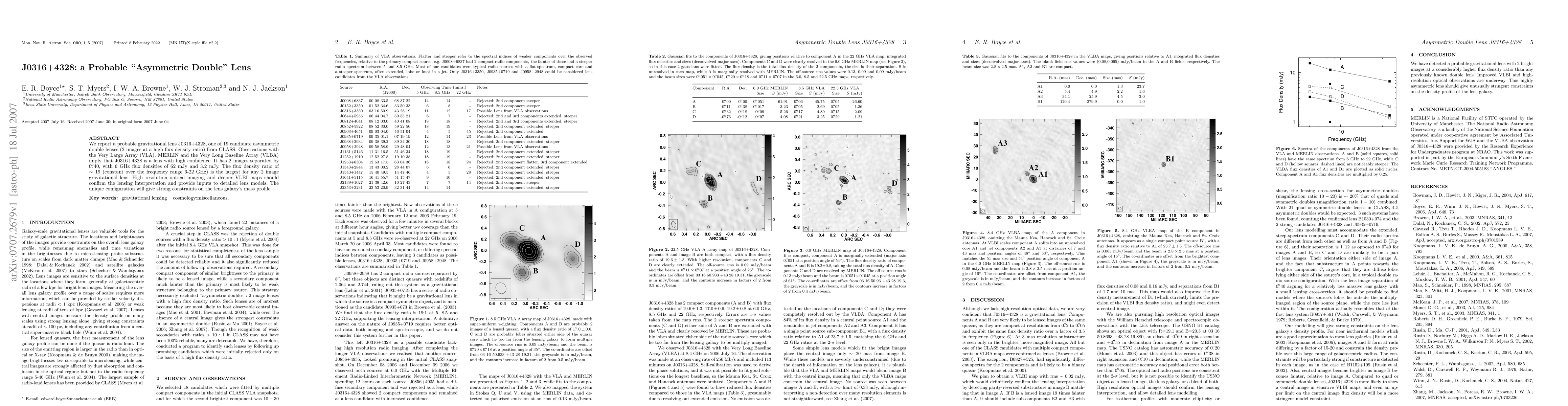 We report a probable gravitational lens J0316+4328, one of 19 candidate asymmetric double lenses (2 images at a high flux density ratio) from CLASS. Observations with the Very Large Array (VLA), MERLIN and the Very Long Baseline Array (VLBA) imply that J0316+4328 is a lens with high confidence. It has 2 images separated by 0.40", with 6 GHz flux densities of 62 mJy and 3.2 mJy. The flux density ratio of ~19 (constant over the frequency range 6-22 GHz) is the largest for any 2 image gravitational lens. High resolution optical imaging and deeper VLBI maps should confirm the lensing interpretation and provide inputs to detailed lens models. The unique configuration will give strong constraints on the lens galaxy's mass profile.