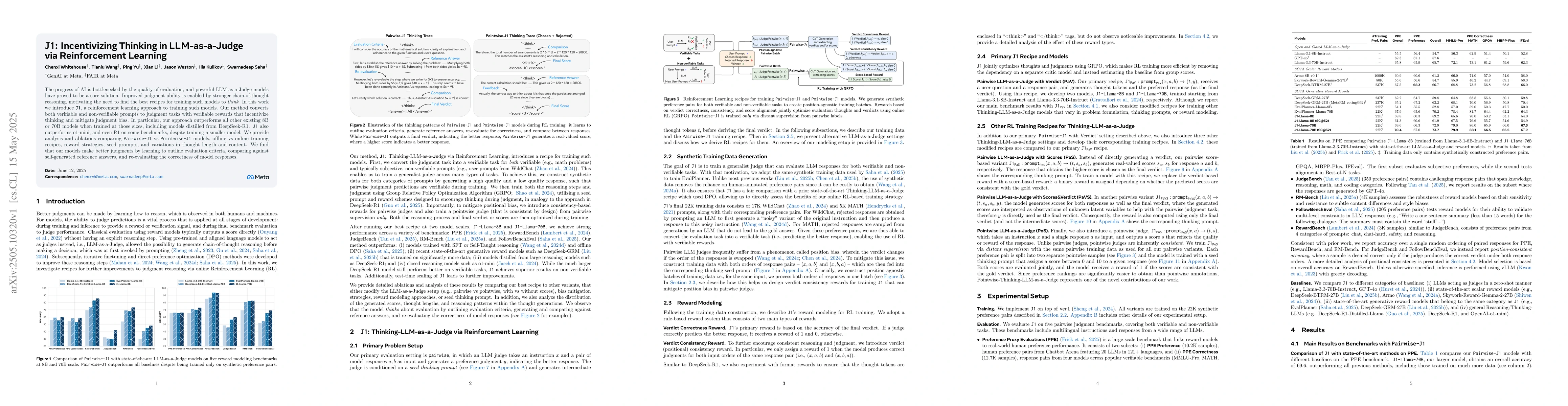 A new reinforcement learning approach called J1 is introduced to train large language models as judges, achieving state-of-the-art results in various benchmarks. J1 incentivizes thinking by providing verifiable rewards and improving judgment ability through chain-of-thought reasoning.