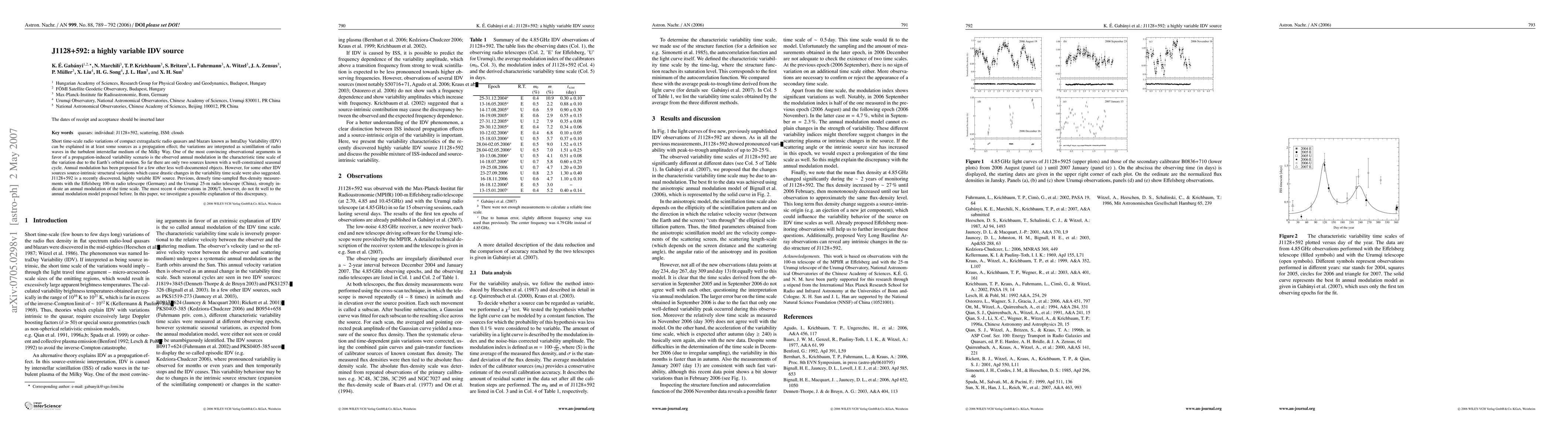 Short time-scale radio variations of compact extragalactic radio quasars and blazars known as IntraDay Variability (IDV) can be explained in at least some sources as a propagation effect; the variations are interpreted as scintillation of radio waves in the turbulent interstellar medium of the Milky Way. One of the most convincing observational arguments in favor of a propagation-induced variability scenario is the observed annual modulation in the characteristic time scale of the variation due to the Earth's orbital motion. So far there are only two sources known with a well-constrained seasonal cycle. Annual modulation has been proposed for a few other less well-documented objects. However, for some other IDV sources source-intrinsic structural variations which cause drastic changes in the variability time scale were also suggested. J1128+592 is a recently discovered, highly variable IDV source. Previous, densely time-sampled flux-density measurements with the Effelsberg 100-m radio telescope (Germany) and the Urumqi 25-m radio telescope (China), strongly indicate an annual modulation of the time scale. The most recent 4 observations in 2006/7, however, do not fit well to the annual modulation model proposed before. In this paper, we investigate a possible explanation of this discrepancy.