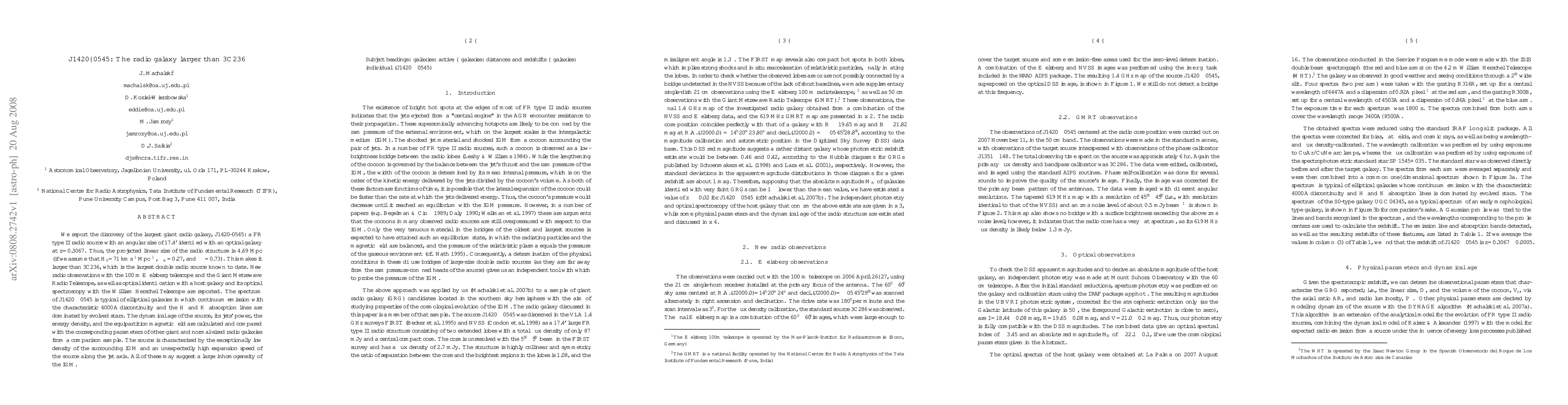 Scientists have discovered a record-breaking giant radio galaxy called J1420-0545, which is larger than the previously known largest double radio source 3C236, with an angular size of 17.4'}. The discovery sheds light on the properties of intergalactic medium and suggests large inhomogeneities in the surrounding space.