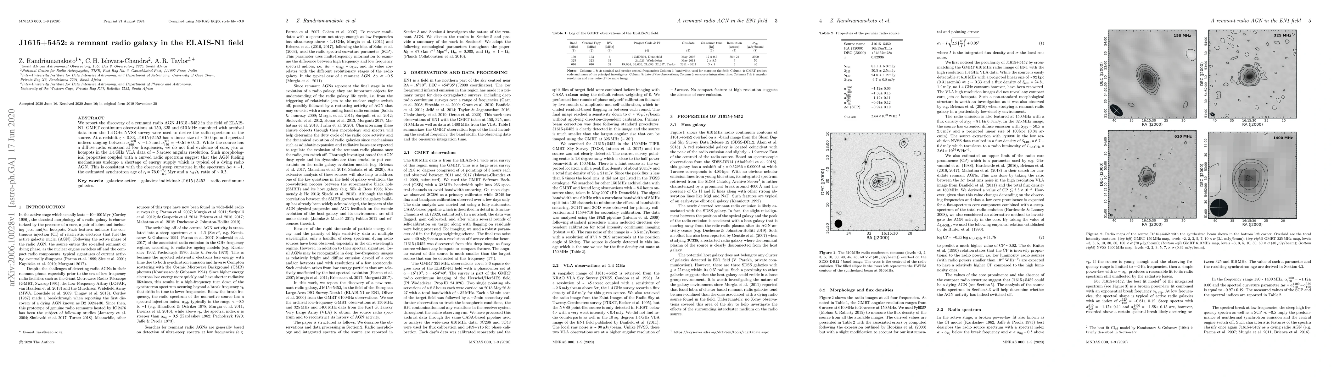 The paper reports the discovery of J1615+5452, a remnant radio AGN in the ELAIS-N1 field, characterized by a steep radio spectrum and lack of core, jets, or hotspots. The source exhibits a synchrotron age of about 76 Myr, indicating a dying radio AGN.