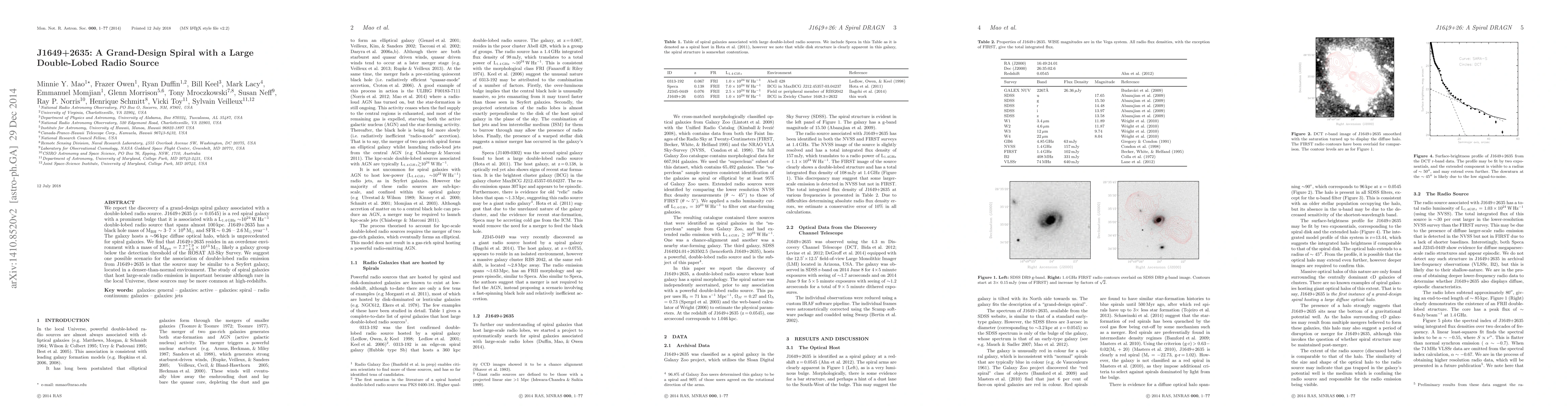 We report the discovery of a grand-design spiral galaxy associated with a double-lobed radio source. J1649+2635 (z = 0.0545) is a red spiral galaxy with a prominent bulge that it is associated with a L$_{1.4{\rm GHz}}\sim$10$^{24}$WHz$^{-1}$ double-lobed radio source that spans almost 100kpc. J1649+2635 has a black hole mass of M$_{\rm BH} \sim$ 3--7 $\times$ 10$^8$M$_{\odot}$ and SFR$\sim$ 0.26 -- 2.6M$_{\odot}$year$^{-1}$. The galaxy hosts a $\sim$96kpc diffuse optical halo, which is unprecedented for spiral galaxies. We find that J1649+2635 resides in an overdense environment with a mass of M$_{dyn} = 7.7^{+7.9}_{-4.3} \times 10^{13}$M$_{\odot}$, likely a galaxy group below the detection threshold of the ROSAT All-Sky Survey. We suggest one possible scenario for the association of double-lobed radio emission from J1649+2635 is that the source may be similar to a Seyfert galaxy, located in a denser-than-normal environment. The study of spiral galaxies that host large-scale radio emission is important because although rare in the local Universe, these sources may be more common at high-redshifts.