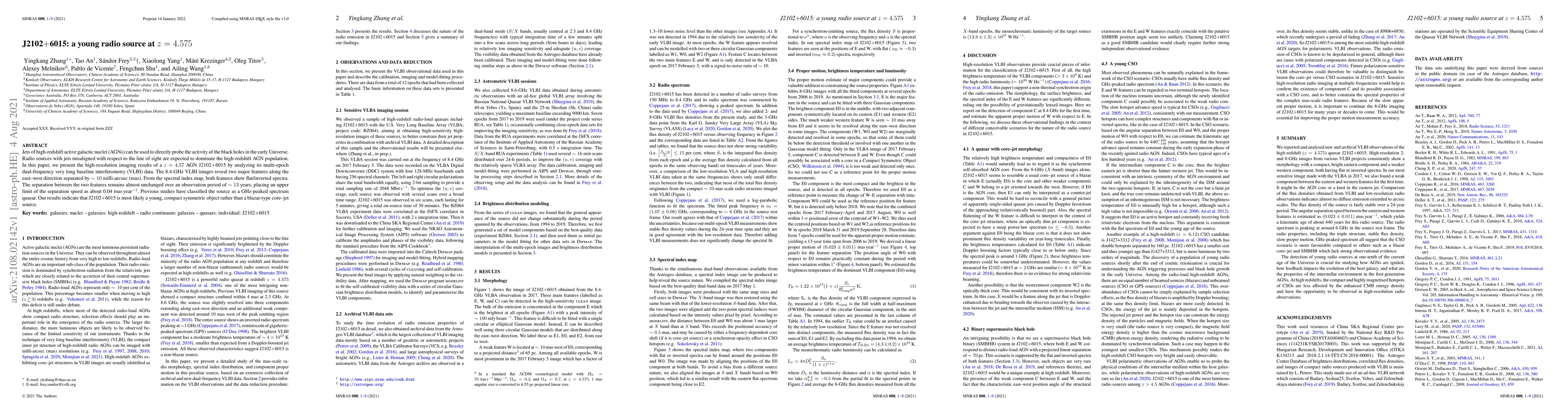 A new study reveals that a z=4.575 radio source, J2102+6015, is likely a young, compact symmetric object rather than a blazar-type core-jet source, with features separated by 10 milli-arcsec remaining unchanged over 13 years.