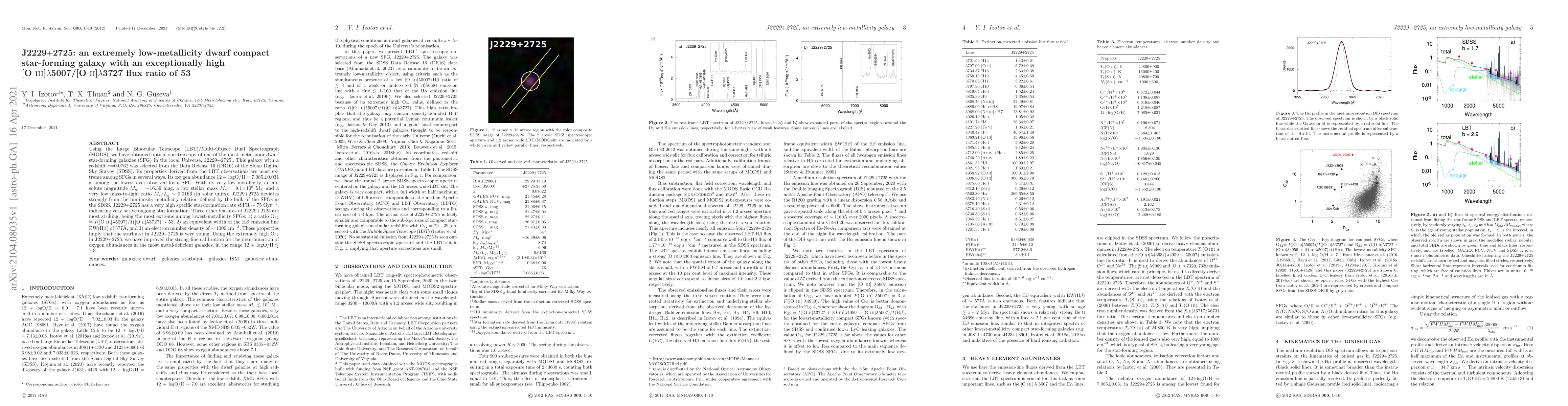 This study reveals J2229+2725, an extremely low-metallicity dwarf star-forming galaxy, characterized by a very high [OIII]5007/[OII]3727 flux ratio of 53, indicating a young starburst. The galaxy's low metallicity, high specific star-formation rate, and deviation from typical luminosity-metallicity relations highlight its unique astrophysical properties.