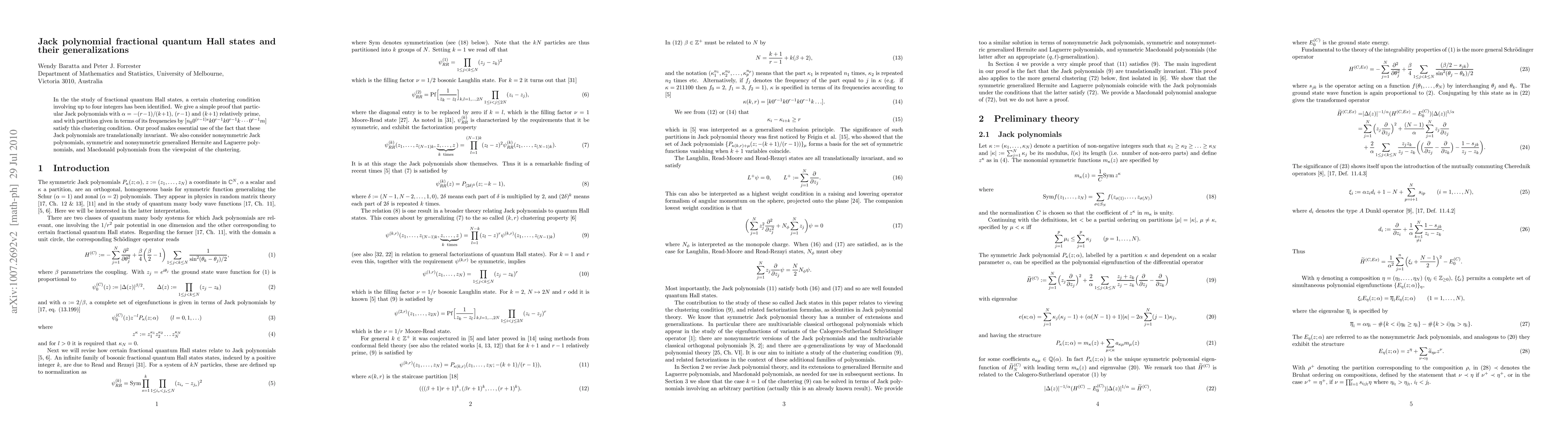 This paper explores the clustering condition for fractional quantum Hall states, proving that specific Jack polynomials with particular parameters satisfy this condition due to their translational invariance. It also examines the broader context of generalized Hermite, Laguerre, and Macdonald polynomials in relation to this clustering.