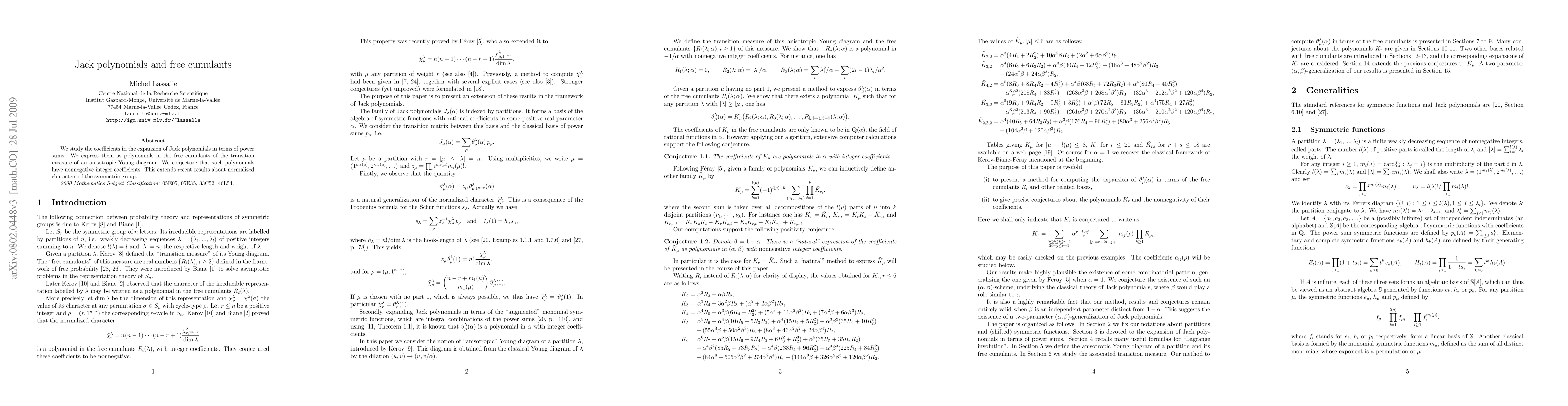 This research explores the coefficients in the expansion of Jack polynomials in terms of power sums, expressing them as polynomials in the free cumulants of an anisotropic Young diagram's transition measure, and conjectures that these polynomials have nonnegative integer coefficients, extending prior results on normalized characters of the symmetric group.