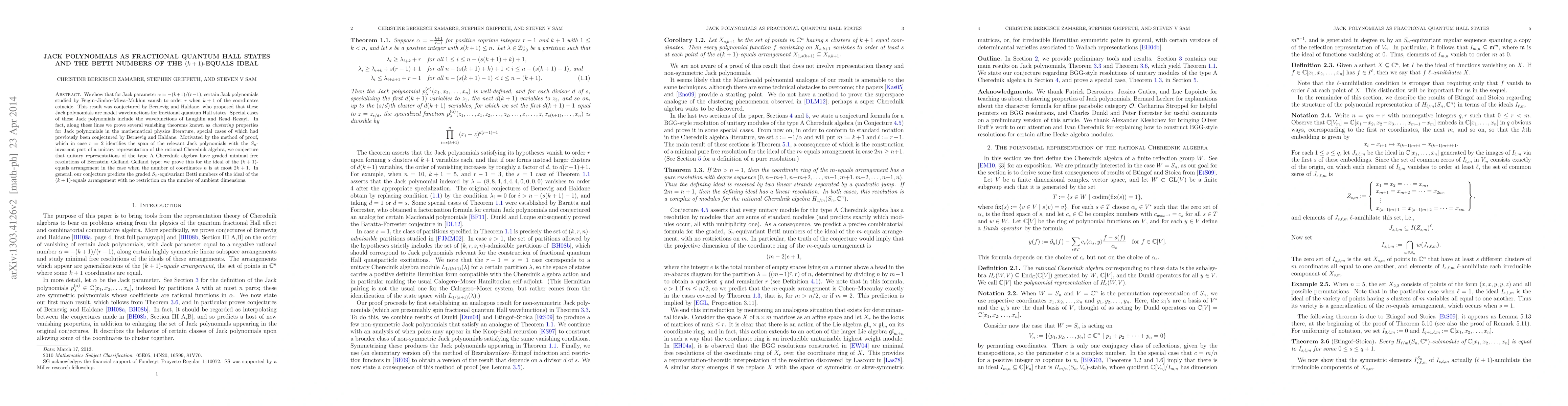 We show that for Jack parameter \alpha = -(k+1)/(r-1), certain Jack polynomials studied by Feigin-Jimbo-Miwa-Mukhin vanish to order r when k+1 of the coordinates coincide. This result was conjectured by Bernevig and Haldane, who proposed that these Jack polynomials are model wavefunctions for fractional quantum Hall states. Special cases of these Jack polynomials include the wavefunctions of Laughlin and Read-Rezayi. In fact, along these lines we prove several vanishing theorems known as clustering properties for Jack polynomials in the mathematical physics literature, special cases of which had previously been conjectured by Bernevig and Haldane. Motivated by the method of proof, which in case r = 2 identifies the span of the relevant Jack polynomials with the S_n-invariant part of a unitary representation of the rational Cherednik algebra, we conjecture that unitary representations of the type A Cherednik algebra have graded minimal free resolutions of Bernstein-Gelfand-Gelfand type; we prove this for the ideal of the (k+1)-equals arrangement in the case when the number of coordinates n is at most 2k+1. In general, our conjecture predicts the graded S_n-equivariant Betti numbers of the ideal of the (k+1)-equals arrangement with no restriction on the number of ambient dimensions.