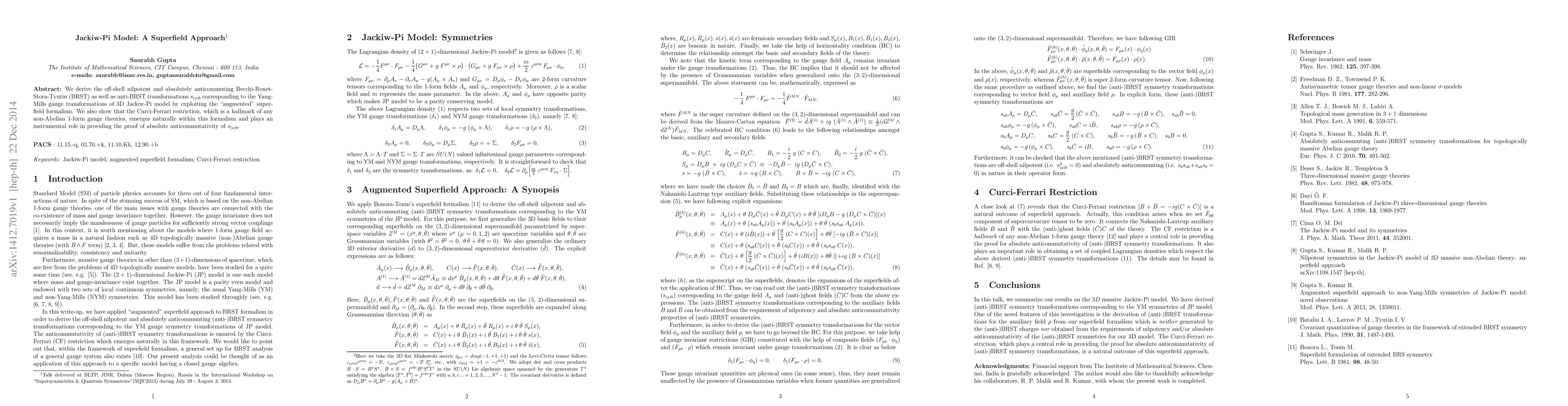This paper derives the BRST and anti-BRST transformations for the 3D Jackiw-Pi model using an augmented superfield formalism, revealing the Curci-Ferrari restriction and proving the absolute anticommutativity of the transformations.