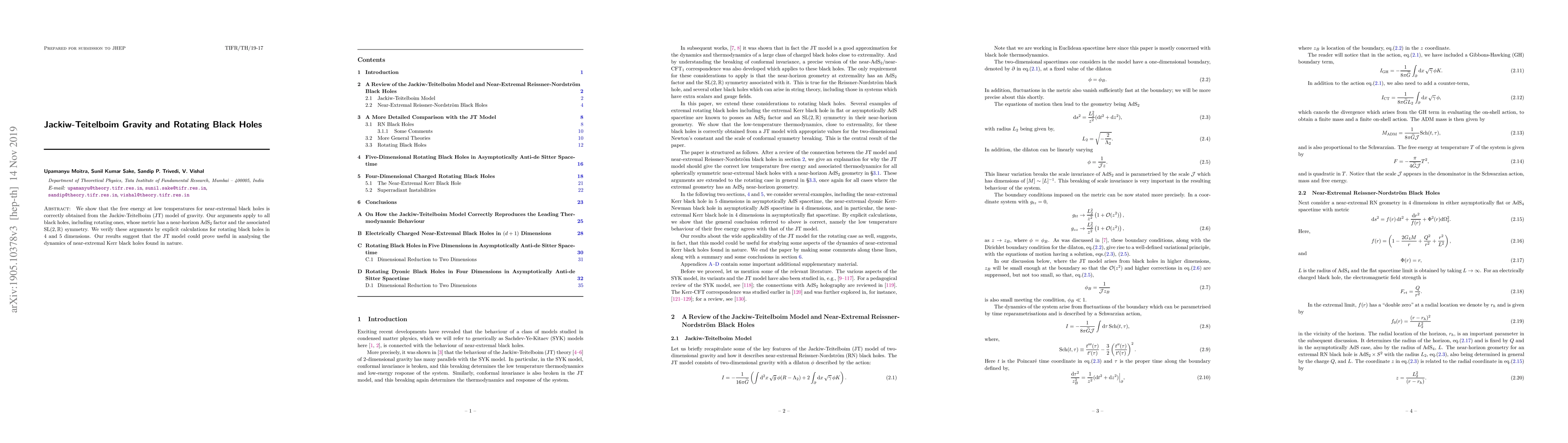 The paper uses analytical arguments and explicit calculations to demonstrate that the free energy of near-extremal black holes, including rotating ones, is correctly obtained from the Jackiw-Teitelboim (JT) model of gravity. The arguments are verified for rotating black holes in 4 and 5 dimensions.