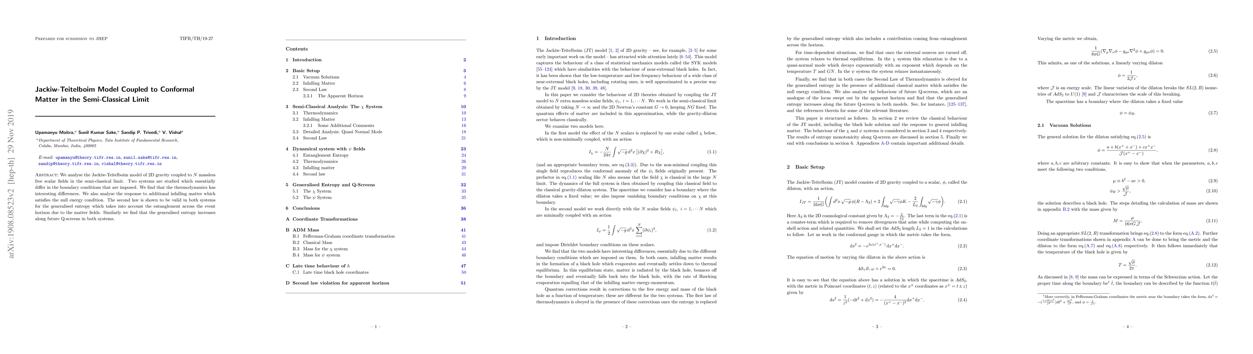 We analyse the Jackiw-Teitelboim model of 2D gravity coupled to $N$ massless free scalar fields in the semi-classical limit. Two systems are studied which essentially differ in the boundary conditions that are imposed. We find that the thermodynamics has interesting differences. We also analyse the response to additional infalling matter which satisfies the null energy condition. The second law is shown to be valid in both systems for the generalised entropy which takes into account the entanglement across the event horizon due to the matter fields. Similarly we find that the generalised entropy increases along future Q-screens in both systems.