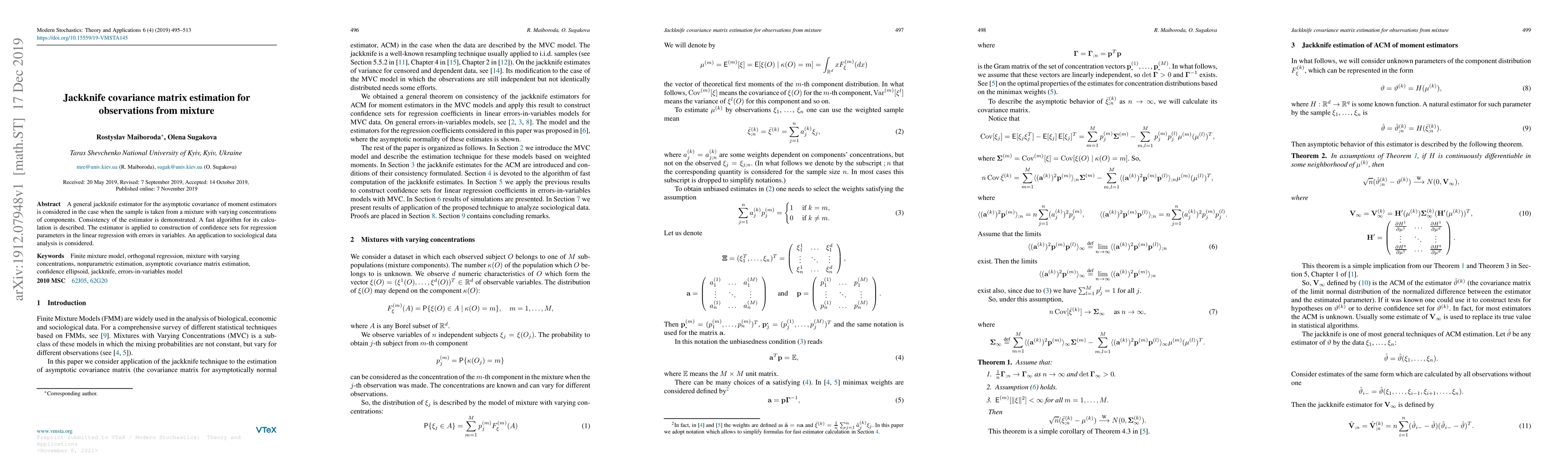 A general jackknife estimator for the asymptotic covariance of moment estimators is considered in the case when the sample is taken from a mixture with varying concentrations of components. Consistency of the estimator is demonstrated. A fast algorithm for its calculation is described. The estimator is applied to construction of confidence sets for regression parameters in the linear regression with errors in variables. An application to sociological data analysis is considered.