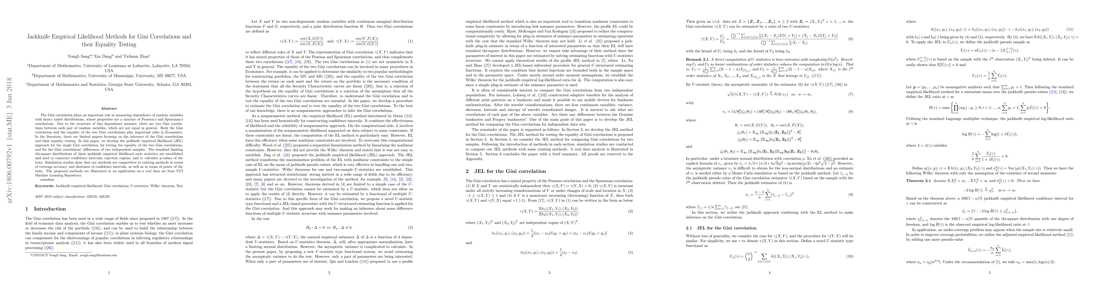 This paper develops jackknife empirical likelihood methods for estimating and testing Gini correlations, which measure dependence in heavy-tailed distributions. It also tests the equality of the two Gini correlations and compares them across two independent samples, providing competitive confidence intervals and test powers.