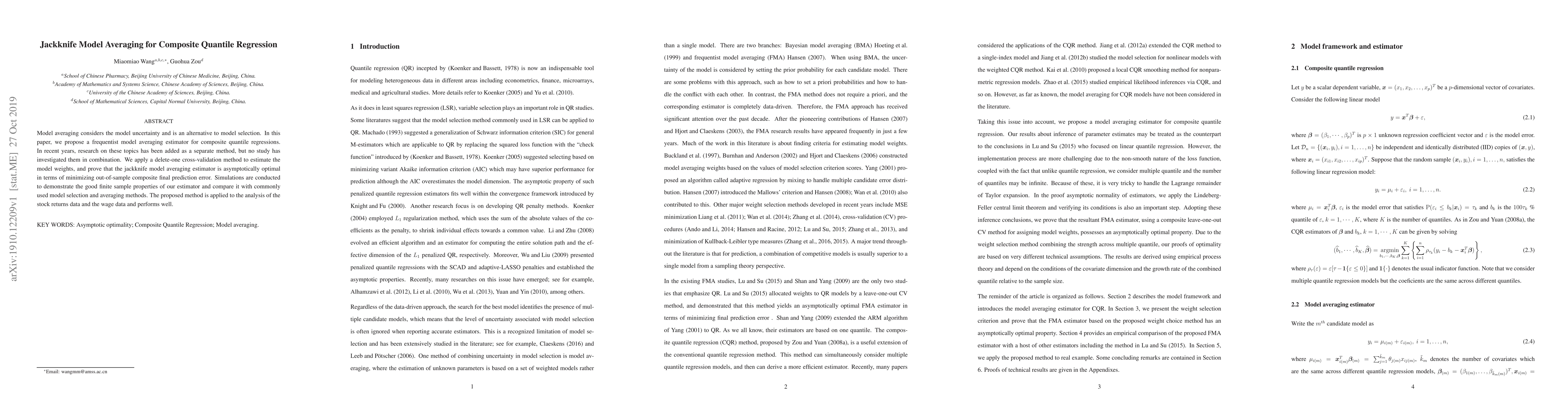 This paper proposes a frequentist model averaging method for composite quantile regression, utilizing a jackknife approach to estimate model weights. The method is shown to be asymptotically optimal and performs well in simulations and real-world data applications, outperforming traditional model selection and averaging techniques.