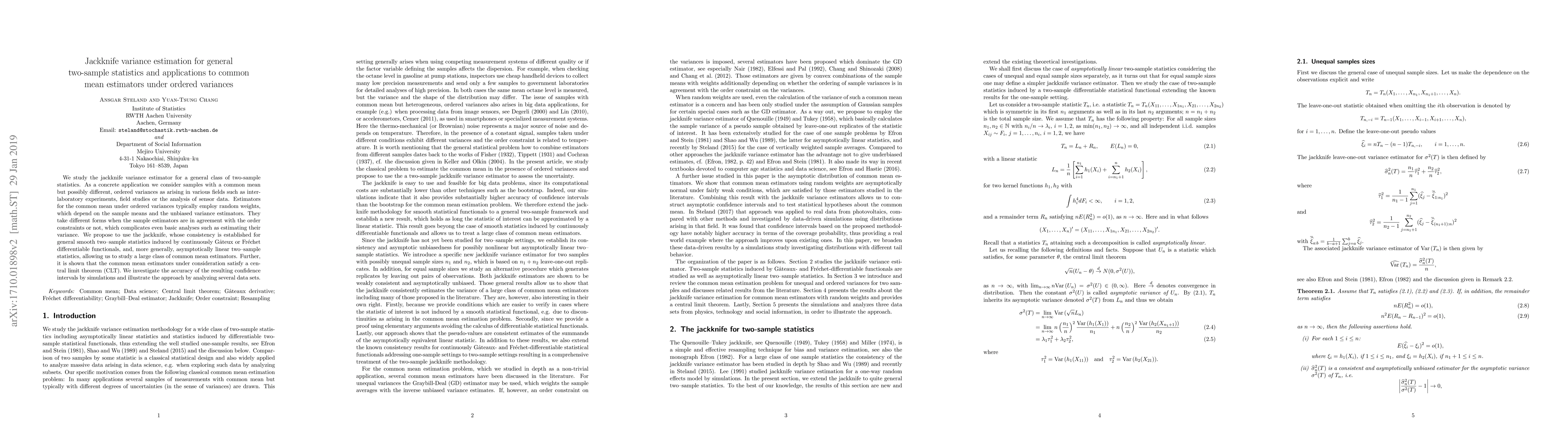 Samples with a common mean but possibly different, ordered variances arise in various fields such as interlaboratory experiments, field studies or the analysis of sensor data. Estimators for the common mean under ordered variances typically employ random weights, which depend on the sample means and the unbiased variance estimators. They take different forms when the sample estimators are in agreement with the order constraints or not, which complicates even basic analyses such as estimating their variance. We propose to use the jackknife, whose consistency is established for general smooth two--sample statistics induced by continuously G\^ateux or Fr\'echet differentiable functionals, and, more generally, asymptotically linear two--sample statistics, allowing us to study a large class of common mean estimators. Further, it is shown that the common mean estimators under consideration satisfy a central limit theorem (CLT). We investigate the accuracy of the resulting confidence intervals by simulations and illustrate the approach by analyzing several data sets.