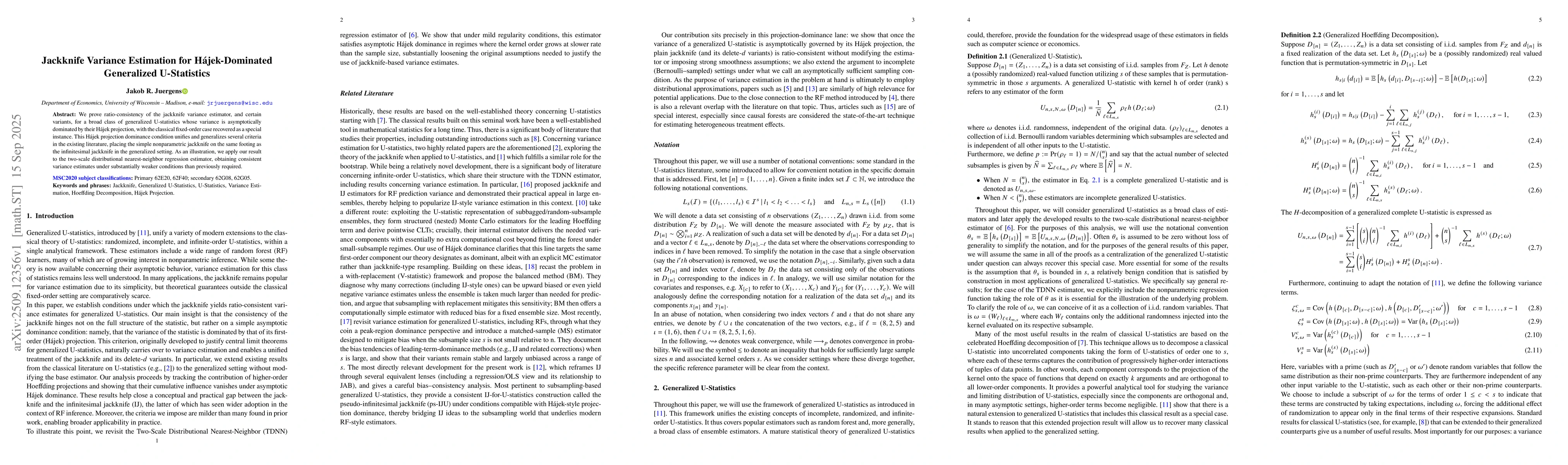 The paper provides a rigorous theoretical analysis of the jackknife method for variance estimation in U-statistics, establishing its asymptotic properties and demonstrating its effectiveness through empirical validation.