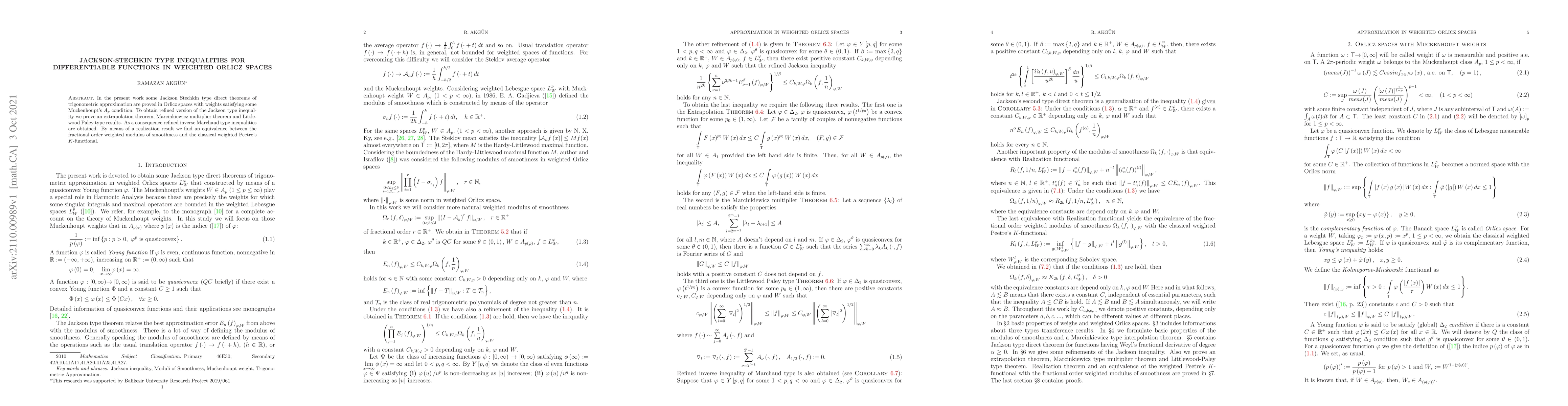 This paper proves Jackson-Stechkin type inequalities for differentiable functions in weighted Orlicz spaces, leveraging techniques like the extrapolation theorem, Marcinkiewicz multiplier theorem, and Littlewood Paley results. The study establishes an equivalence between the fractional order weighted modulus of smoothness and the classical weighted Peetre's K-functional.