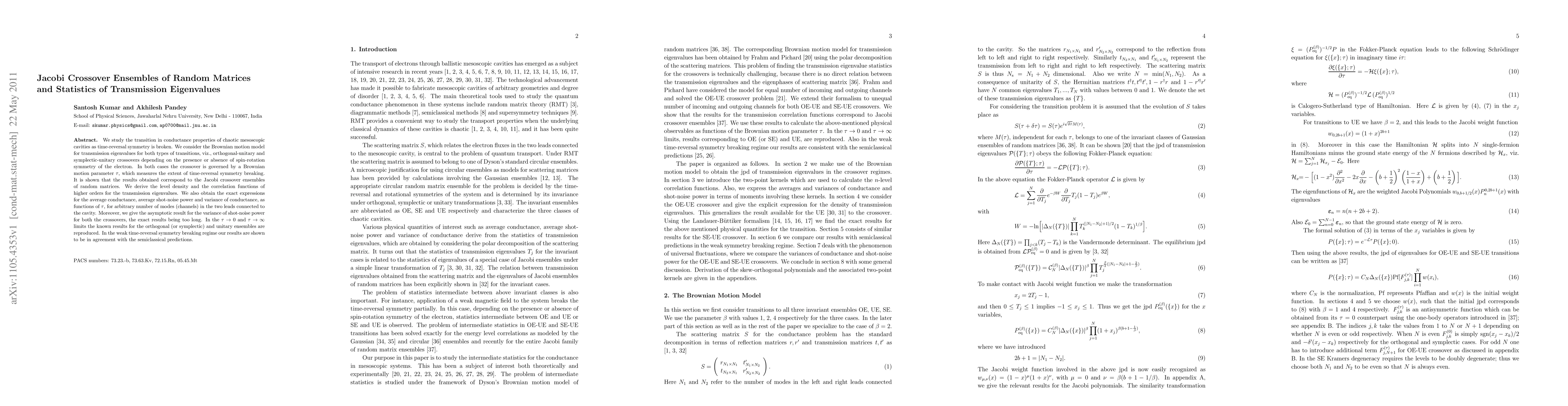 The study investigates how breaking time-reversal symmetry in chaotic cavities affects conductance properties, finding that the transition is governed by a Brownian motion parameter and results in transmission eigenvalues following Jacobi crossover ensembles of random matrices.
