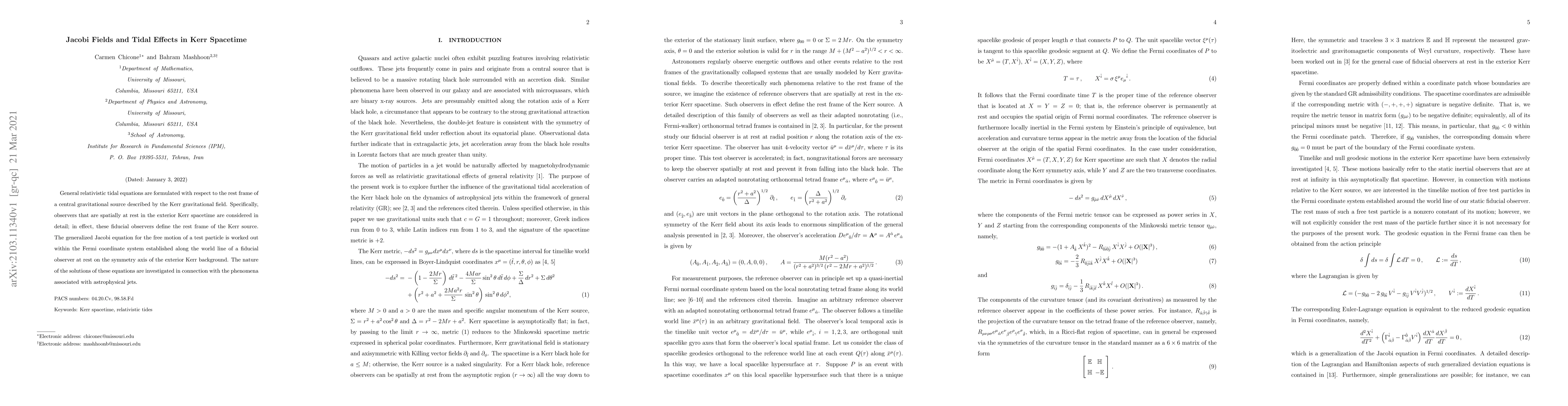 This paper formulates general relativistic tidal equations for a central gravitational source in Kerr spacetime, focusing on fiducial observers at rest in the exterior spacetime. The study derives the generalized Jacobi equation for test particles in the Fermi coordinate system and examines its solutions in relation to astrophysical jets.