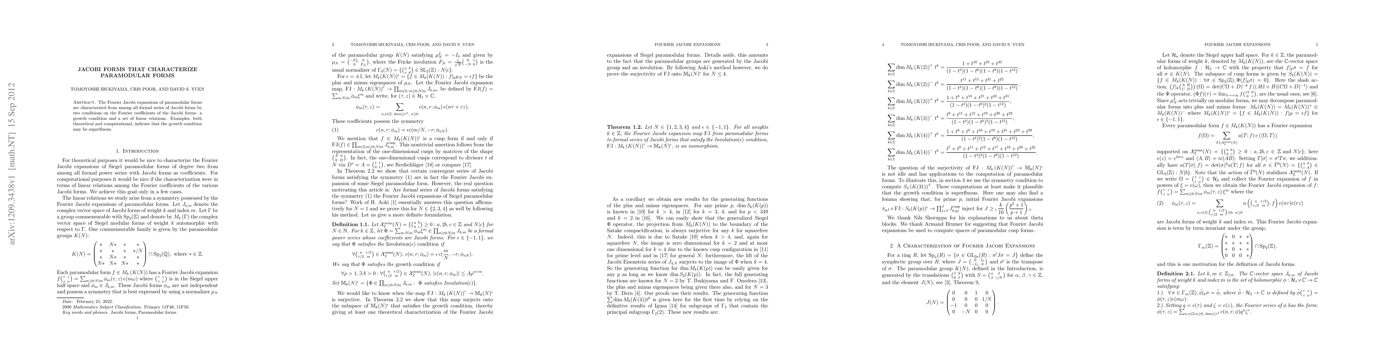 This paper characterizes paramodular forms through their Fourier Jacobi expansions, distinguishing them by specific growth conditions and linear relations on their Fourier coefficients. Theoretical and computational examples suggest the growth condition might not be necessary.