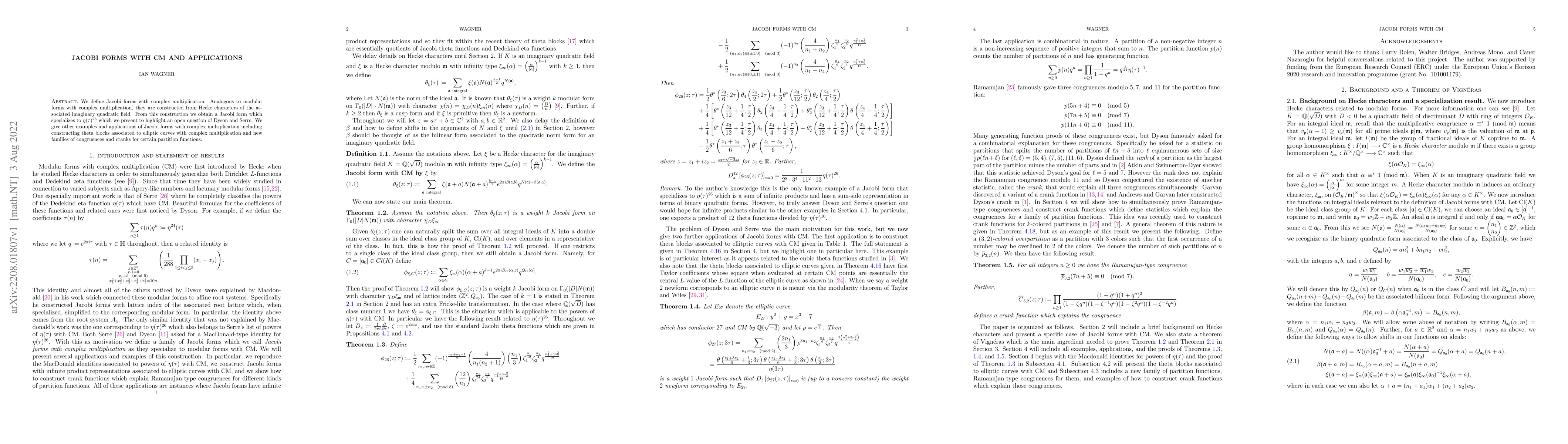 This paper defines Jacobi forms with complex multiplication, constructed from Hecke characters of associated imaginary quadratic fields, and presents examples including a Jacobi form specializing to $\eta(\tau)^{26}$. It also explores applications such as theta blocks for elliptic curves with complex multiplication and new congruences for partition functions.