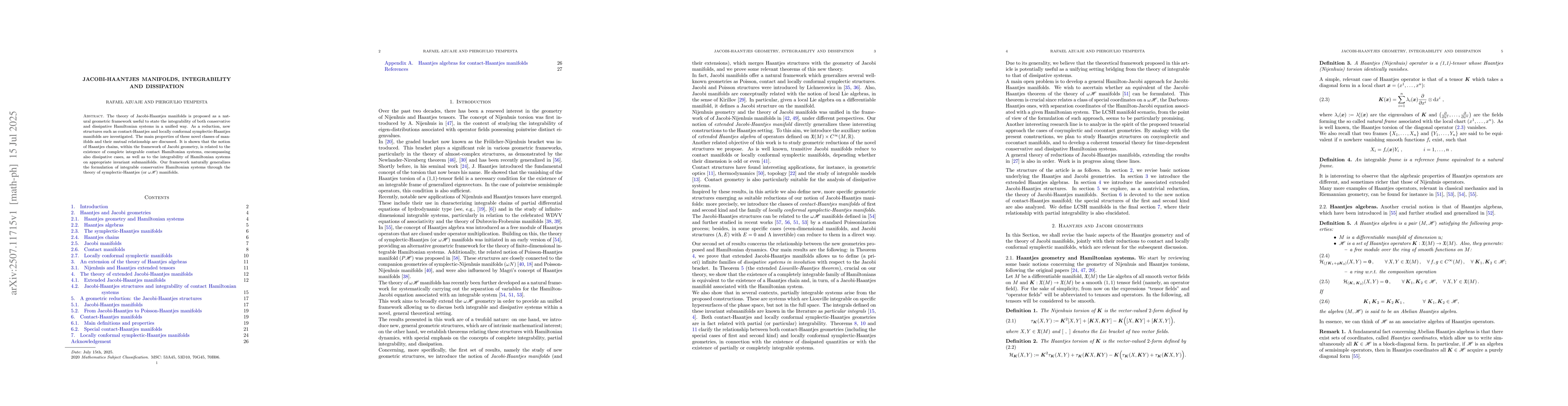 This paper introduces Jacobi-Haantjes manifolds as a unified geometric framework for studying both conservative and dissipative Hamiltonian systems' integrability. It explores new manifold structures like contact-Haantjes and locally conformal symplectic-Haantjes, and demonstrates that Haantjes chains in Jacobi geometry relate to complete integrable contact Hamiltonian systems, including dissipative ones, and integrability on specific submanifolds. This approach extends the symplectic-Haantjes (or u03c9H) manifold theory for integrable conservative systems.