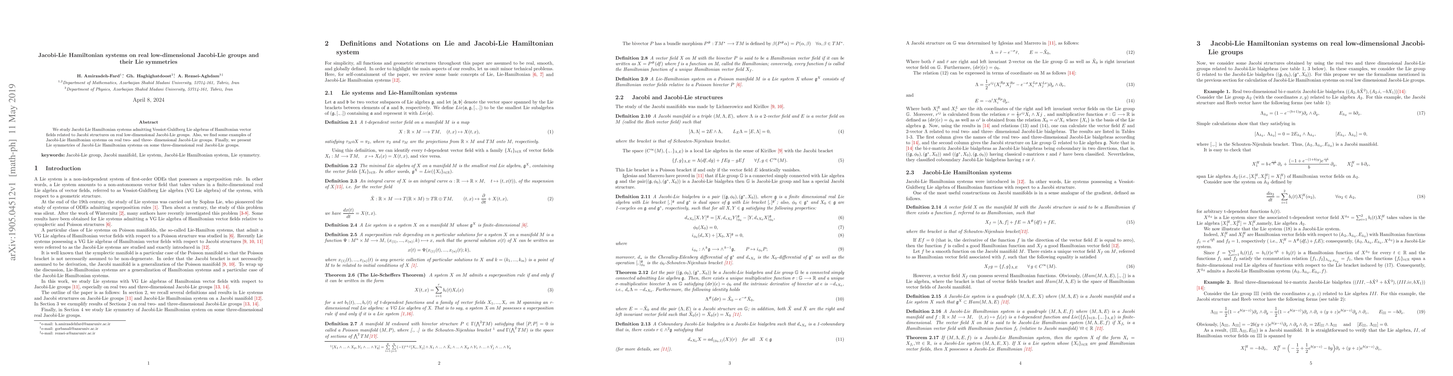 We study Jacobi-Lie Hamiltonian systems admitting Vessiot-Guldberg Lie algebras of Hamiltonian vector fields related to Jacobi structures on real low-dimensional Jacobi-Lie groups. Also, we find some examples of Jacobi-Lie Hamiltonian systems on real two- and three- dimensional Jacobi-Lie groups. Finally, we present Lie symmetries of Jacobi-Lie Hamiltonian systems on some three-dimensional real Jacobi-Lie groups.
