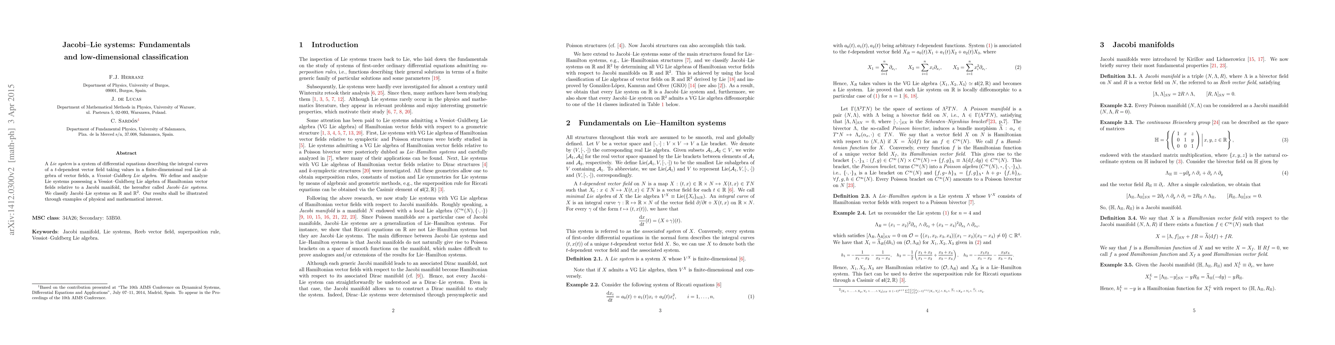 A Lie system is a system of differential equations describing the integral curves of a $t$-dependent vector field taking values in a finite-dimensional real Lie algebra of vector fields, a Vessiot-Guldberg Lie algebra. We define and analyze Lie systems possessing a Vessiot-Guldberg Lie algebra of Hamiltonian vector fields relative to a Jacobi manifold, the hereafter called Jacobi-Lie systems. We classify Jacobi-Lie systems on $\mathbb{R}$ and $\mathbb{R}^2$. Our results shall be illustrated through examples of physical and mathematical interest.