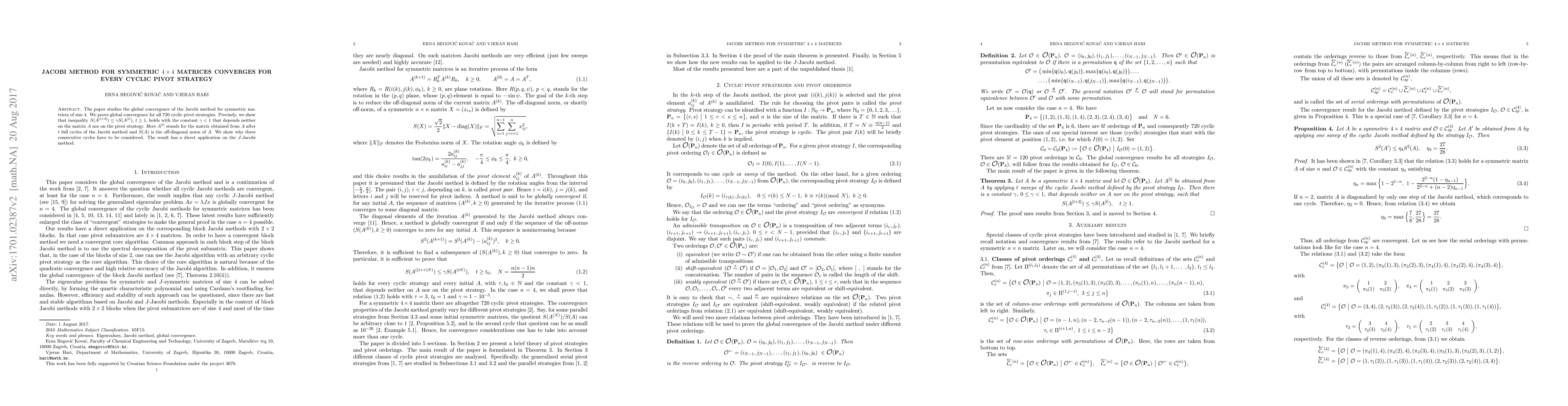 The Jacobi method for symmetric 4x4 matrices converges globally with a constant gamma less than 1 for every cyclic pivot strategy.