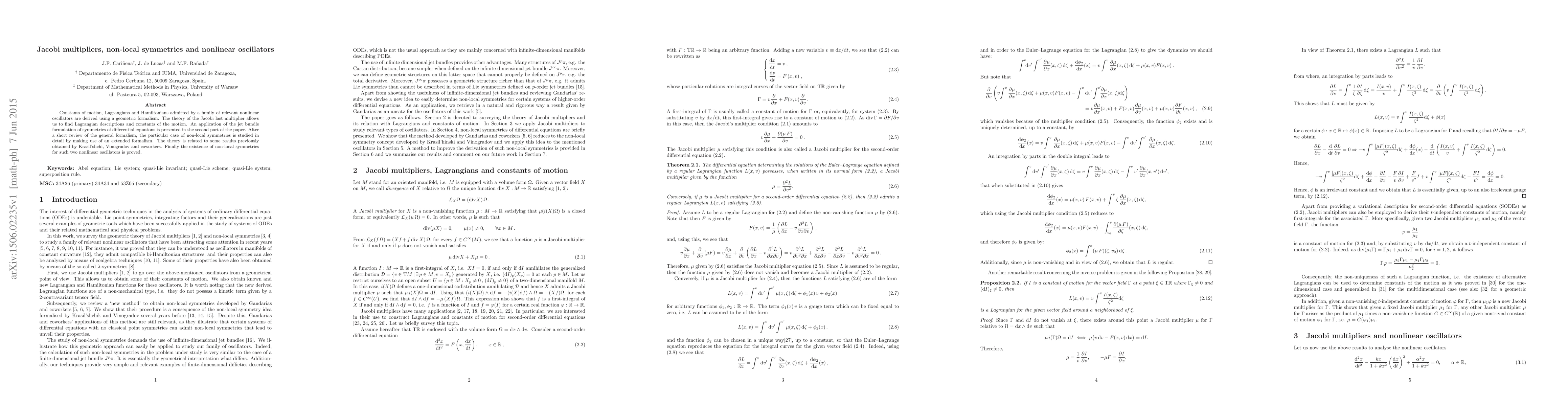 This paper derives constants of motion and Lagrangians for nonlinear oscillators using Jacobi multipliers and a geometric formalism. It applies the jet bundle formulation to explore non-local symmetries, proving the existence of such symmetries for specific nonlinear oscillators.