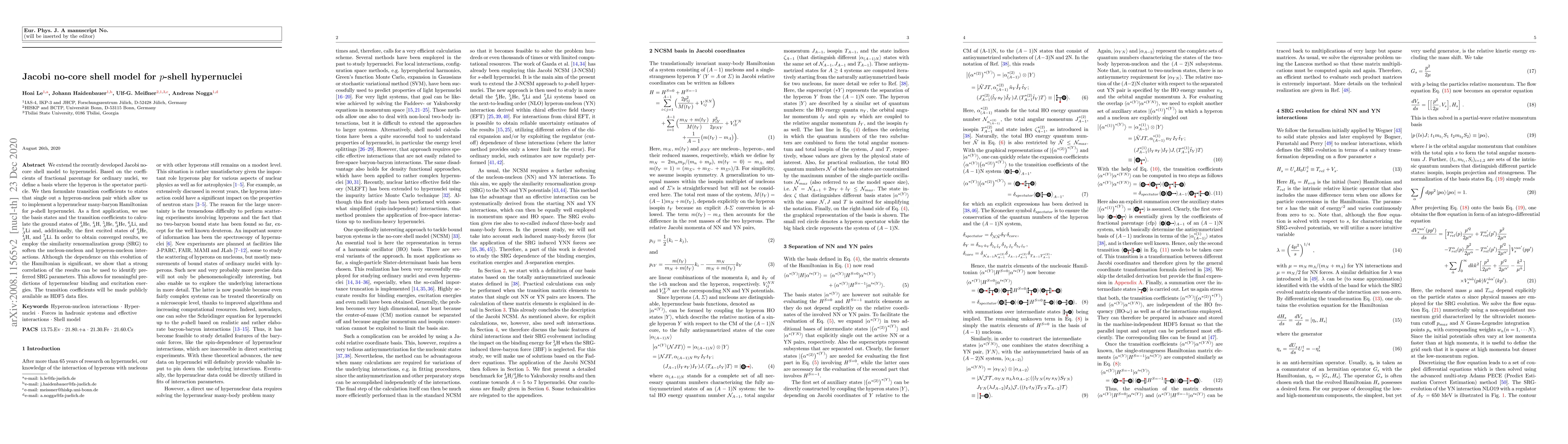 The research extends the Jacobi no-core shell model to hypernuclei, defining a basis where the hyperon is the spectator particle. Transition coefficients are formulated to single out a hyperon-nucleon pair, allowing for a hypernuclear many-baryon Hamiltonian for $p$-shell hypernuclei. The similarity renormalization group (SRG) is employed to soften nucleon-nucleon and hyperon-nucleon interactions for converged results.