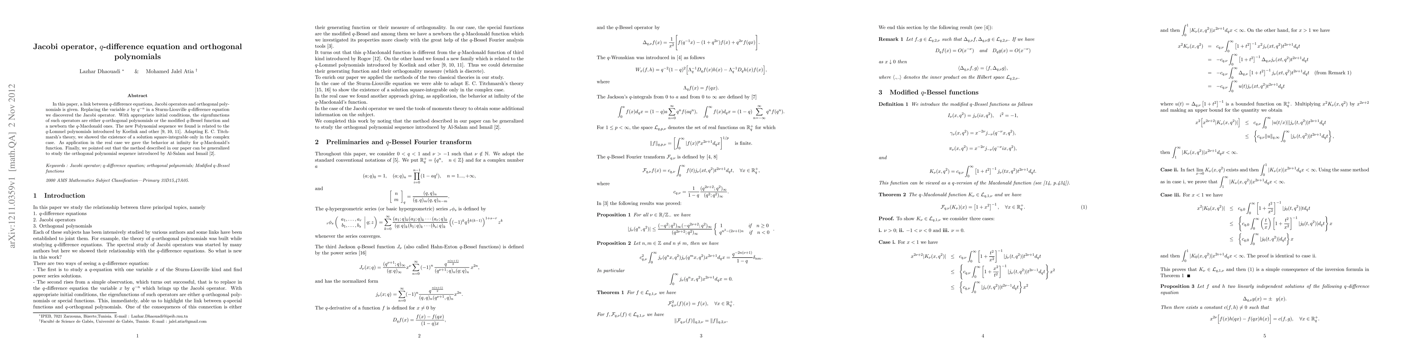 In this paper, a link between $q$-difference equations, Jacobi operators and orthogonal polynomials is given. Replacing the variable $x$ by $ q^{-n}$ in a Sturm-Liouville $q$-difference equation we discovered the Jacobi operator. With appropriate initial conditions, the eigenfunctions of such operators are either $q$-orthogonal polynomials or the modified $q$-Bessel function and a newborn the $q$-Macdonald ones. The new Polynomial sequence we found is related to the $q$-Lommel polynomials introduced by Koelink and other. Adapting E. C. Titchmarsh's theory, we showed the existence of a solution square-integrable only in the complex case. As application in the real case we gave the behavior at infinity for $q$-Macdonald's function. Finally, we pointed out that the method described in our paper can be generalized to study the orthogonal polynomial sequence introduced by Al-Salam and Ismail