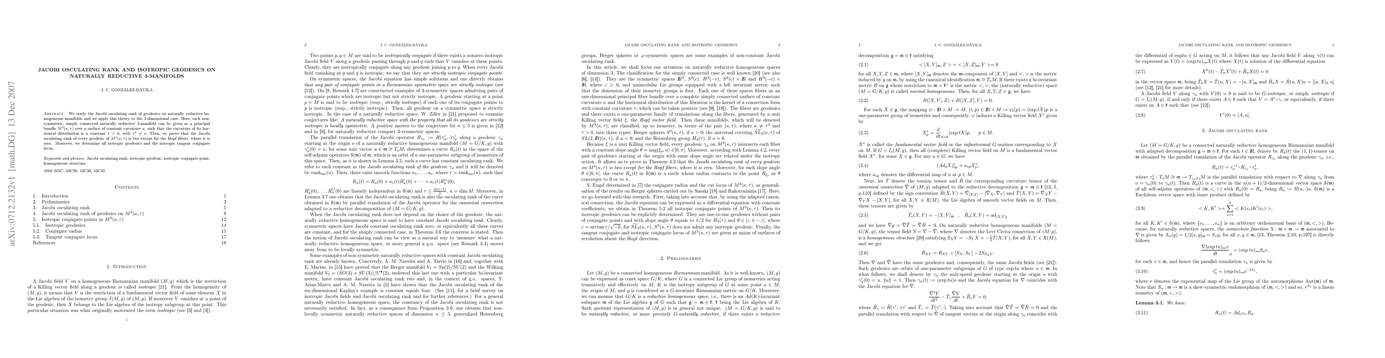 This paper investigates the Jacobi osculating rank of geodesics on naturally reductive homogeneous 3-manifolds, showing that it is two everywhere except along Hopf fibers where it is zero. It also identifies all isotropic geodesics and the associated isotropic tangent conjugate locus.