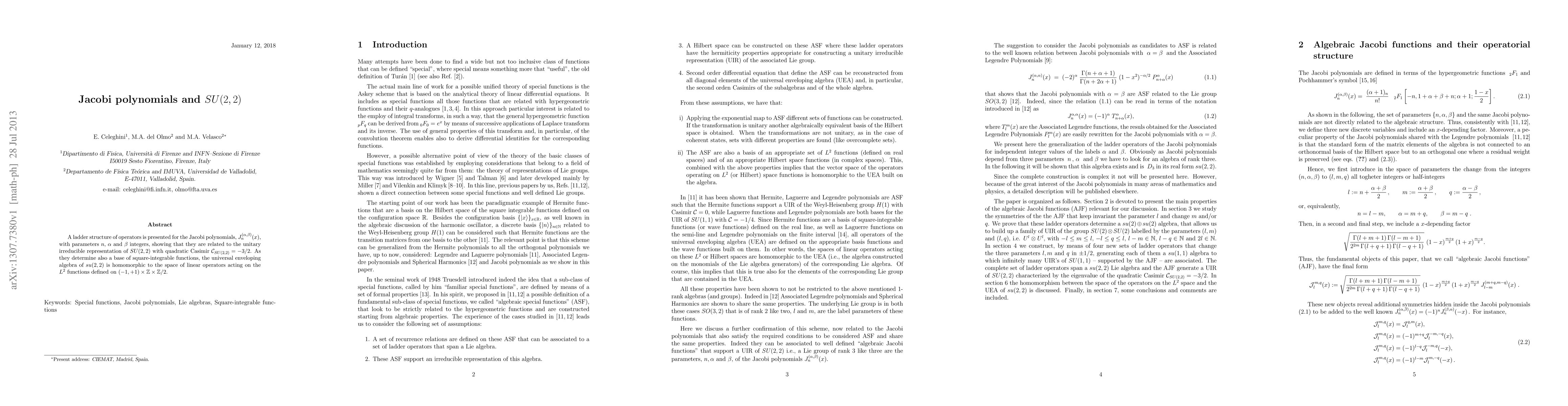 A ladder structure of operators is presented for the Jacobi polynomials, J_n^(a,b)(x), with parameters n, a and b integers, showing that they are related to the unitary irreducible representation of SU(2,2) with quadratic Casimir C_SU(2,2)=-3/2. As they determine also a base of square-integrable functions, the universal enveloping algebra of su(2,2) is homomorphic to the space of linear operators acting on the L^2 functions defined on (-1,+1) x Z x Z/2.