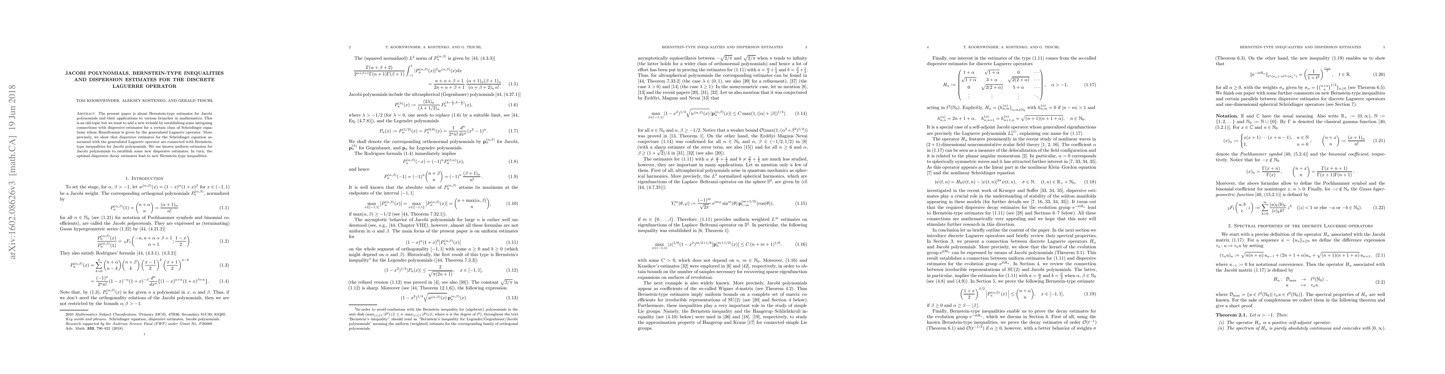 The present paper is about Bernstein-type estimates for Jacobi polynomials and their applications to various branches in mathematics. This is an old topic but we want to add a new wrinkle by establishing some intriguing connections with dispersive estimates for a certain class of Schr\"odinger equations whose Hamiltonian is given by the generalized Laguerre operator. More precisely, we show that dispersive estimates for the Schr\"odinger equation associated with the generalized Laguerre operator are connected with Bernstein-type inequalities for Jacobi polynomials. We use known uniform estimates for Jacobi polynomials to establish some new dispersive estimates. In turn, the optimal dispersive decay estimates lead to new Bernstein-type inequalities.