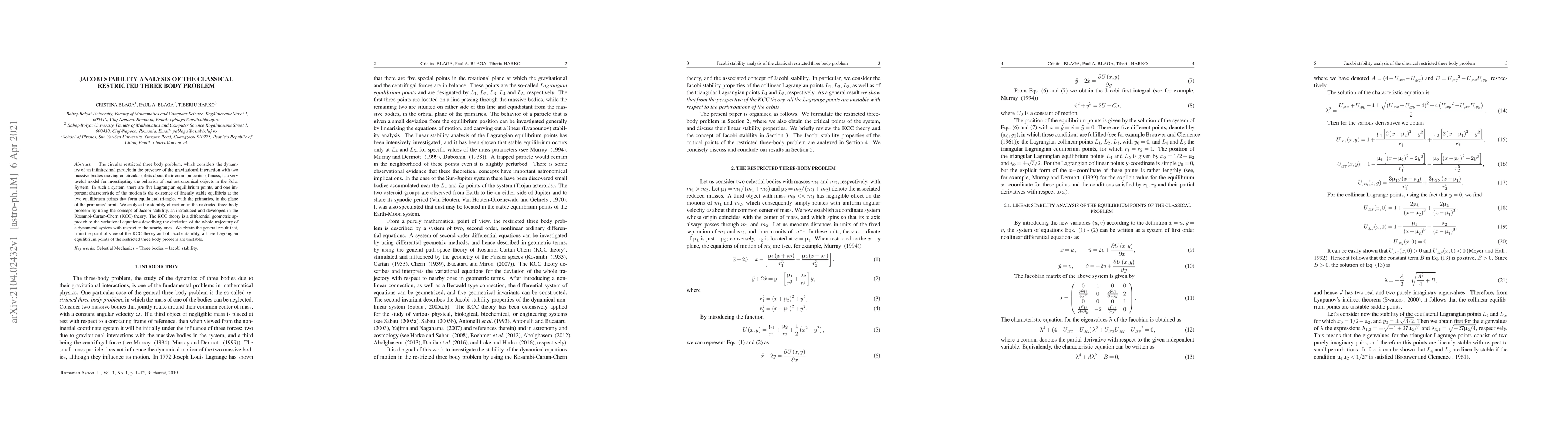 This paper investigates the stability of the classical restricted three body problem using Jacobi stability from the Kosambi-Cartan-Chern (KCC) theory, revealing that all five Lagrangian equilibrium points are unstable according to this approach. Despite the existence of linearly stable equilibria at two points, the overall motion is deemed unstable under the KCC framework.