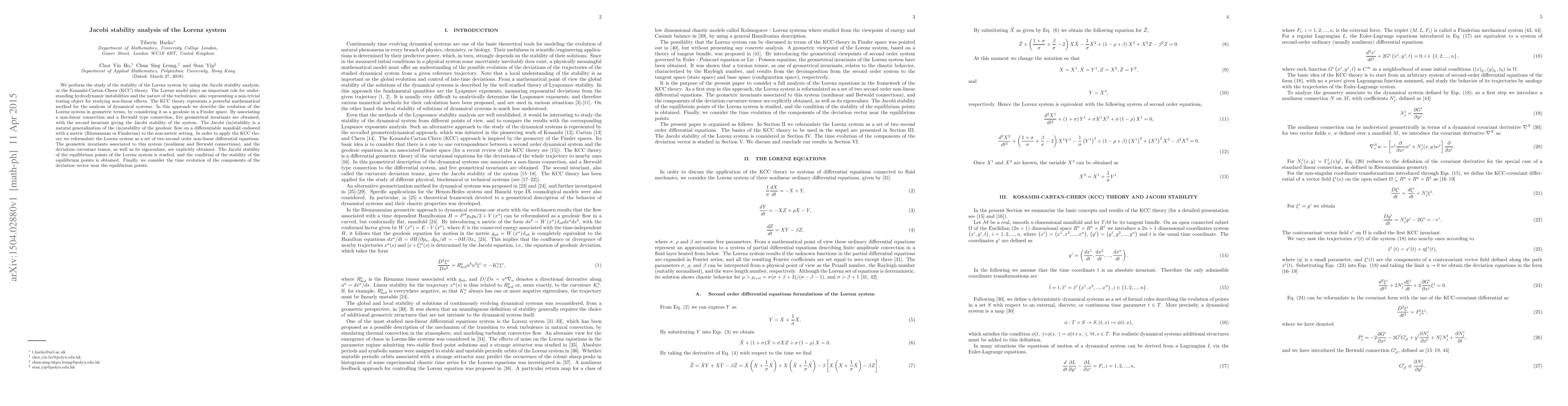 This paper employs Jacobi stability analysis using the Kosambi-Cartan-Chern theory to study the stability of the Lorenz system, a model for hydrodynamic instabilities and turbulence. The Lorenz system is reformulated as a set of two second-order non-linear differential equations, and geometric invariants are derived to determine the Jacobi stability of its equilibrium points.
