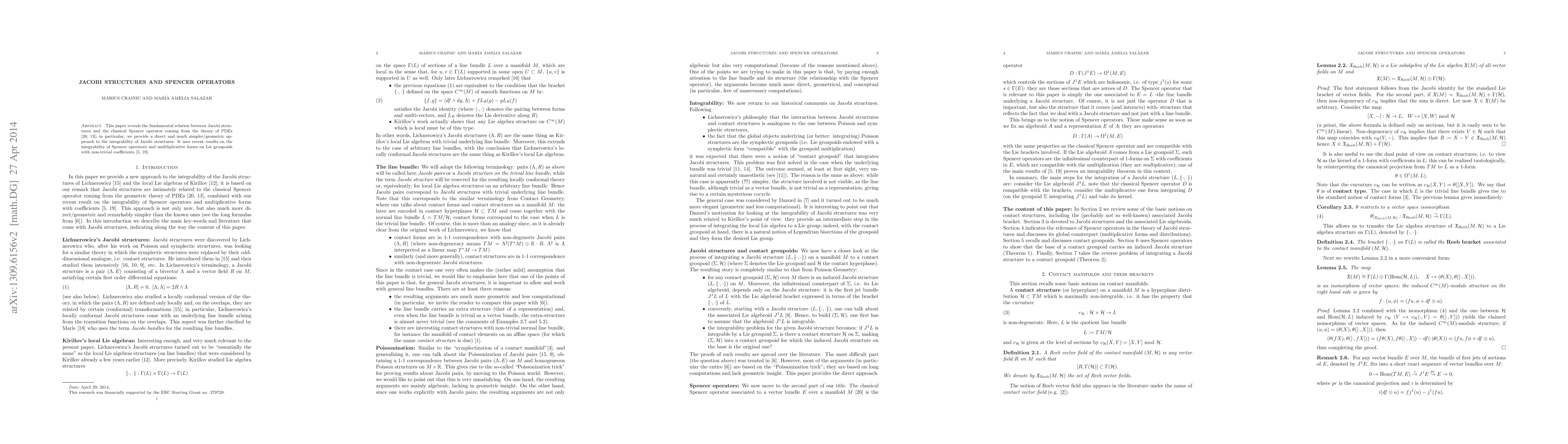 This paper establishes a connection between Jacobi structures and the classical Spencer operator from PDE theory, offering a geometric perspective on the integrability of Jacobi structures. It demonstrates that the Spencer operator associated with a contact groupoid implies the presence of a Jacobi structure on the base manifold, and it explores the integration of Jacobi structures into contact groupoids.