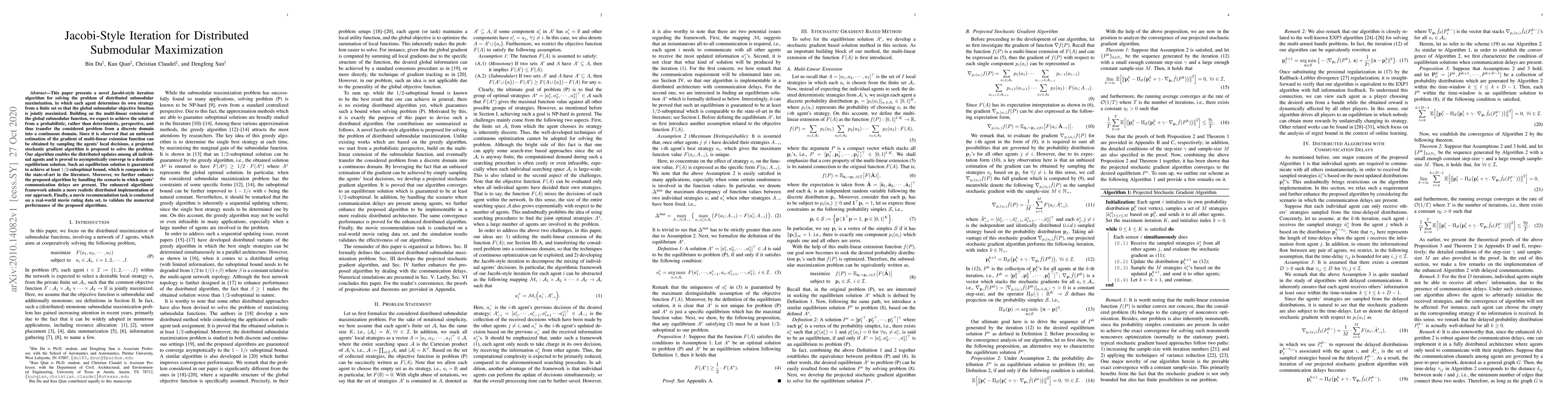 This paper introduces a Jacobi-style iterative algorithm for distributed submodular maximization, leveraging multi-linear extensions and stochastic gradient methods to achieve probabilistic convergence. The algorithm is shown to handle communication delays and achieves at least 1/2-suboptimality, validated through a real-world movie recommendation task.