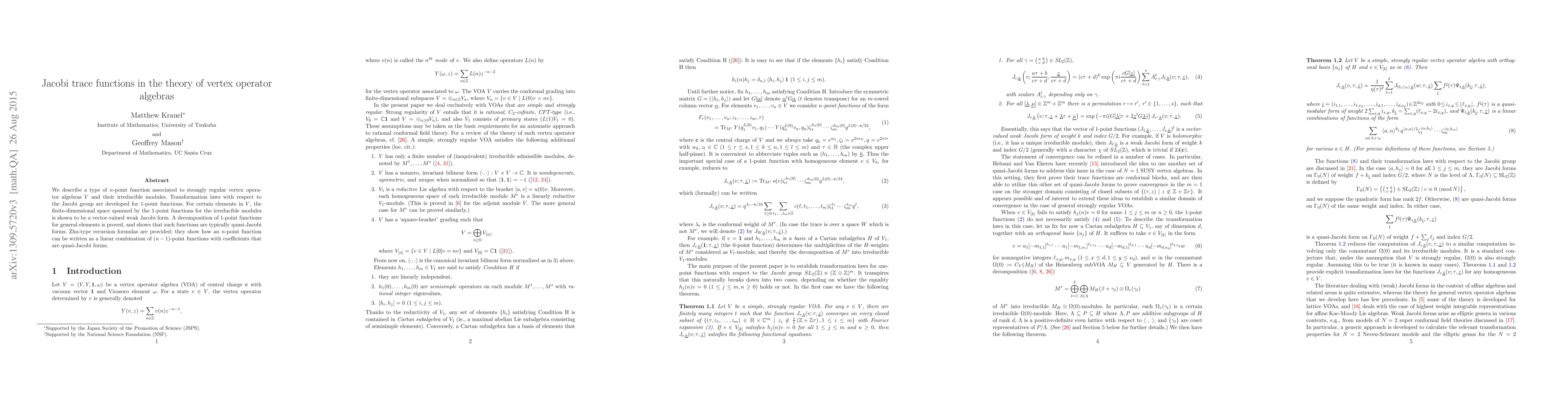 We describe a type of n-point function associated to strongly regular vertex operator algebras V and their irreducible modules. Transformation laws with respect to the Jacobi group are developed for 1-point functions. For certain elements in V, the finite-dimensional space spanned by the corresponding 1-point functions for the inequivalent irreducible modules is shown to be a vector-valued weak Jacobi form. A decomposition of 1-point functions for general elements is proved, and shows that such functions are typically quasi-Jacobi forms. Zhu-type recursion formulas are proved; they show how an n-point function can be written as a linear combination of (n-1)-point functions with coefficients that are quasi-Jacobi forms.