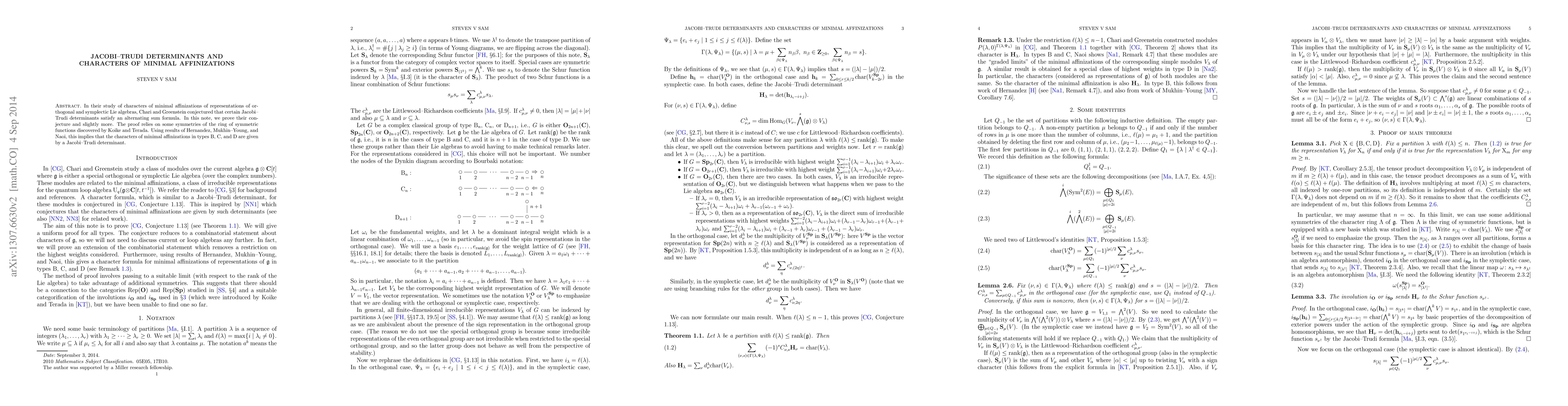 This paper proves Chari and Greenstein's conjecture regarding Jacobi-Trudi determinants and the characters of minimal affinizations of orthogonal and symplectic Lie algebras. The proof leverages symmetries in the ring of symmetric functions and results from Hernandez, Mukhin-Young, and Naoi, establishing that the characters in types B, C, and D are given by Jacobi-Trudi determinants.