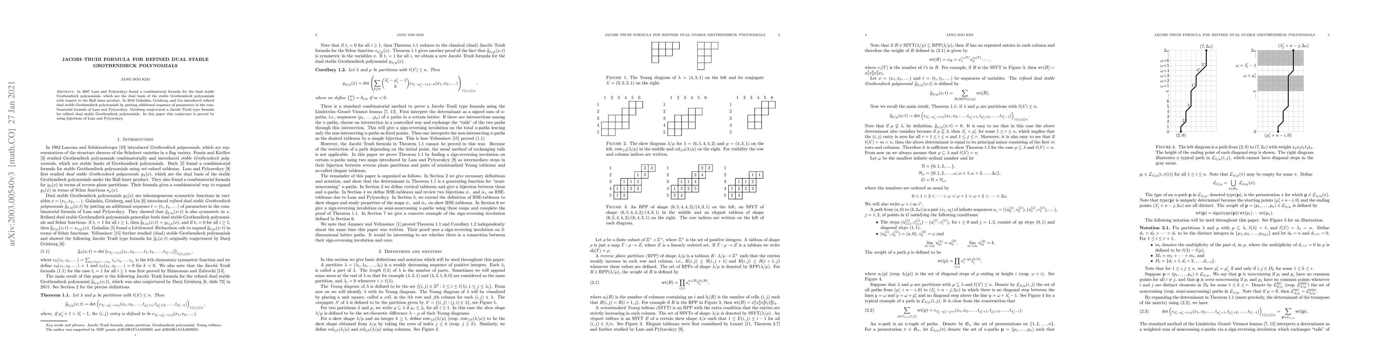 The paper utilizes bijections introduced by Lam and Pylyavskyy to prove a conjecture regarding a Jacobi--Trudi formula for refined dual stable Grothendieck polynomials, building upon previous work by Lam and Pylyavskyy on combinatorial formulas and by Galashin, Grinberg, and Liu on refined polynomials.