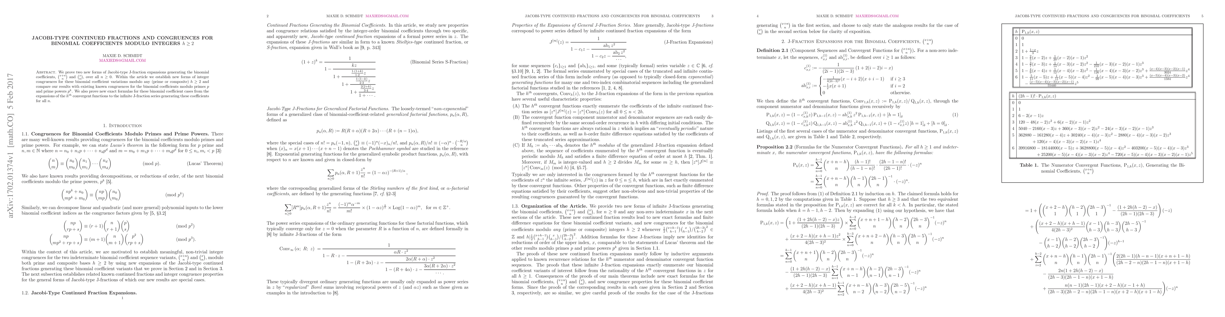 We prove two new forms of Jacobi-type J-fraction expansions generating the binomial coefficients, $\binom{x+n}{n}$ and $\binom{x}{n}$, over all $n \geq 0$. Within the article we establish new forms of integer congruences for these binomial coefficient variations modulo any (prime or composite) $h \geq 2$ and compare our results with existing known congruences for the binomial coefficients modulo primes $p$ and prime powers $p^k$. We also prove new exact formulas for these binomial coefficient cases from the expansions of the $h^{th}$ convergent functions to the infinite J-fraction series generating these coefficients for all $n$.