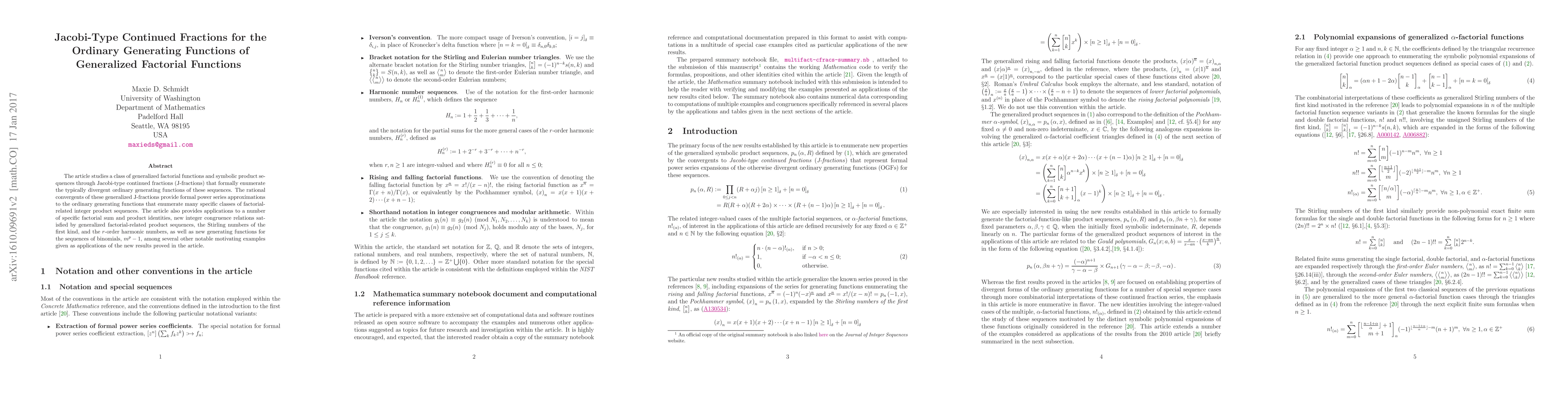 The article studies a class of generalized factorial functions and symbolic product sequences through Jacobi type continued fractions (J-fractions) that formally enumerate the divergent ordinary generating functions of these sequences. The more general definitions of these J-fractions extend the known expansions of the continued fractions originally proved by Flajolet that generate the rising factorial function, or Pochhammer symbol, $(x)_n$, at any fixed non-zero indeterminate $x \in \mathbb{C}$. The rational convergents of these generalized J-fractions provide formal power series approximations to the ordinary generating functions that enumerate many specific classes of factorial-related integer product sequences. The article also provides applications to a number of specific identities, new integer congruence relations satisfied by generalized factorial-related product sequences and the $r$-order harmonic numbers, among several other notable motivating examples as immediate applications of the new results. In this sense, the article serves as a semi-comprehensive, detailed survey reference that introduces applications to many established and otherwise well-known combinatorial identities, new cases of generating functions for factorial-function-related product sequences, and other examples of the generalized integer-valued multifactorial, or $\alpha$-factorial, function sequences. The convergent-based generating function techniques illustrated by the particular examples cited within the article are easily extended to enumerate the factorial-like product sequences arising in the context of many other specific applications.