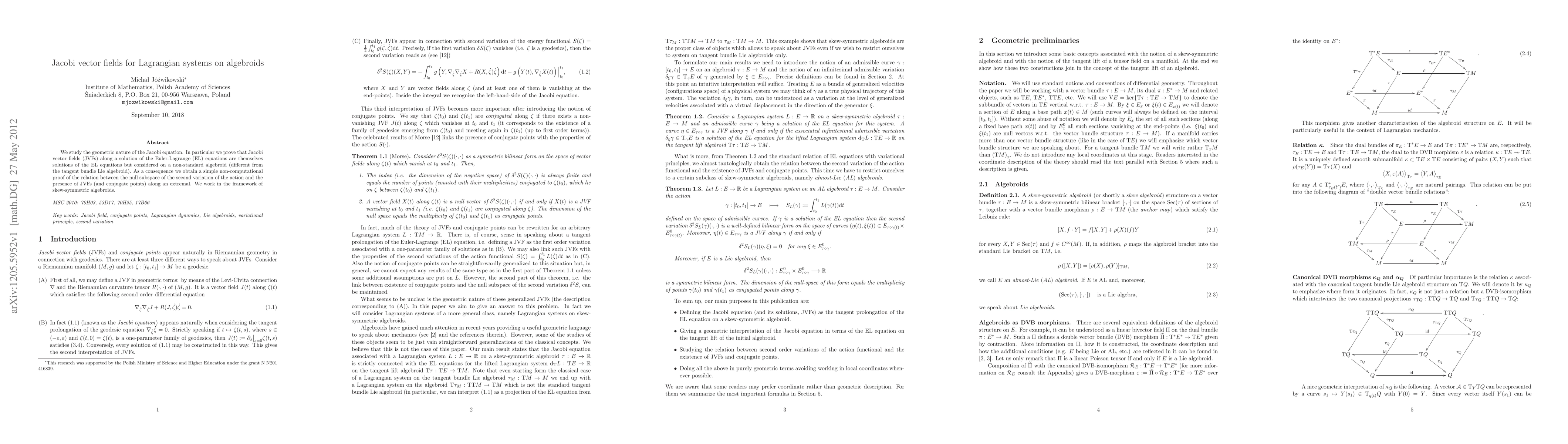 We study the geometric nature of the Jacobi equation. In particular we prove that Jacobi vector fields (JVFs) along a solution of the Euler-Lagrange (EL) equations are themselves solutions of the EL equations but considered on a non-standard algebroid (different from the tangent bundle Lie algebroid). As a consequence we obtain a simple non-computational proof of the relation between the null subspace of the second variation of the action and the presence of JVFs (and conjugate points) along an extremal. We work in the framework of skew-symmetric algebroids.