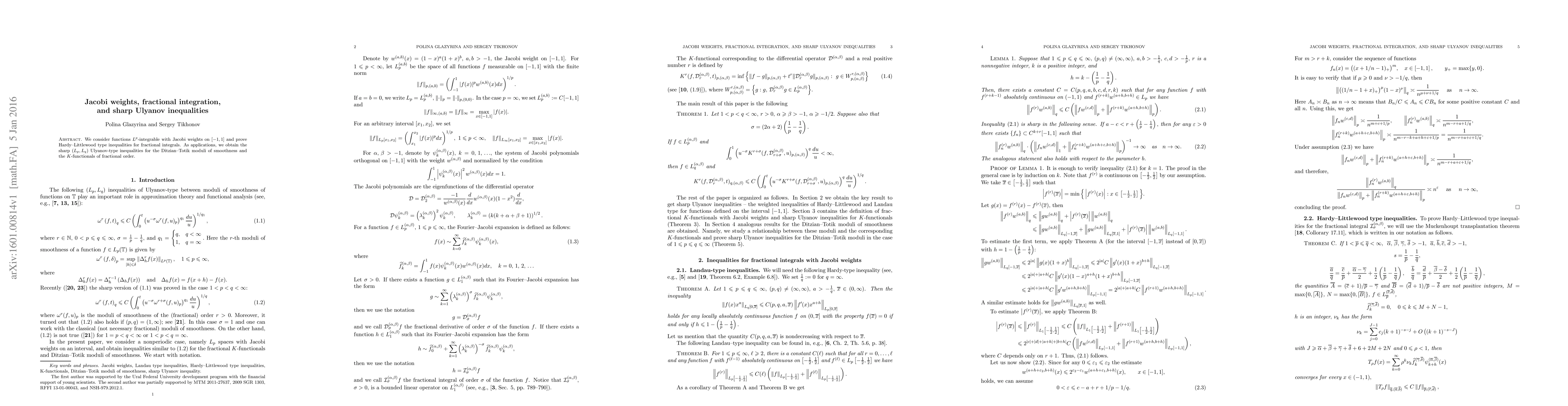 We consider functions L_p-integrable with Jacobi weights on [-1,1] and prove Hardy--Littlewood type inequalities for fractional integrals. As applications, we obtain the sharp (L_p, L_q) Ulyanov-type inequalities for the Ditzian--Totik moduli of smoothness and the K-functionals of fractional order.