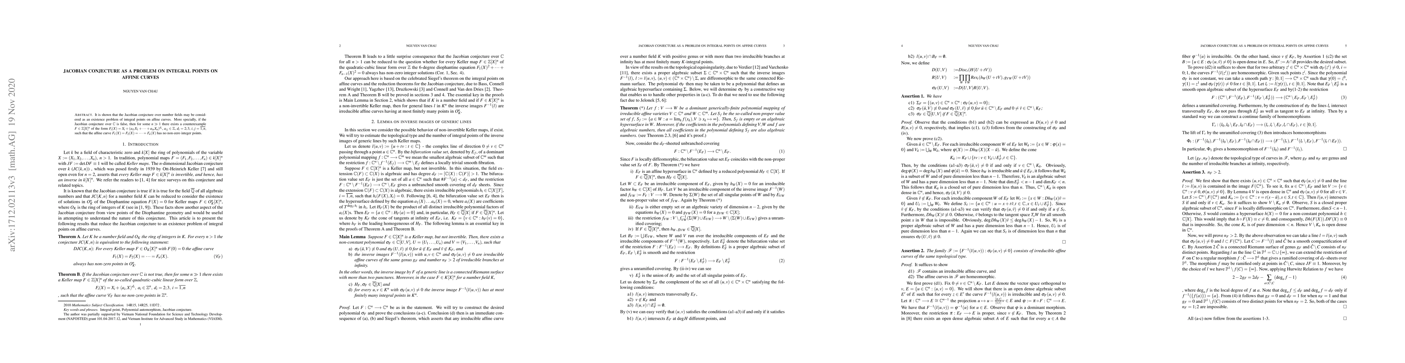 The paper demonstrates that the $n$-dimensional Jacobian conjecture over algebraic number fields can be framed as an existence problem of integral points on affine curves. If the Jacobian conjecture over $\mathbb{C}$ is false, then for sufficiently large $n$, a counterexample exists in $\mathbb{Z}[X]^n$ showing that certain affine curves have no non-zero integer solutions.
