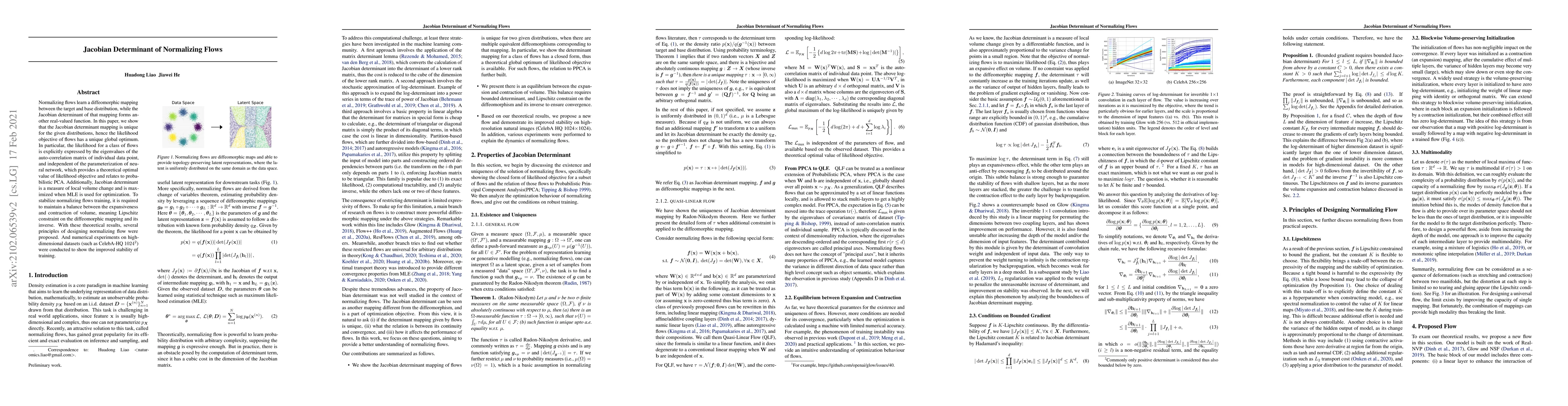 Normalizing flows learn a diffeomorphic mapping between the target and base distribution, while the Jacobian determinant of that mapping forms another real-valued function. In this paper, we show that the Jacobian determinant mapping is unique for the given distributions, hence the likelihood objective of flows has a unique global optimum. In particular, the likelihood for a class of flows is explicitly expressed by the eigenvalues of the auto-correlation matrix of individual data point, and independent of the parameterization of neural network, which provides a theoretical optimal value of likelihood objective and relates to probabilistic PCA. Additionally, Jacobian determinant is a measure of local volume change and is maximized when MLE is used for optimization. To stabilize normalizing flows training, it is required to maintain a balance between the expansiveness and contraction of volume, meaning Lipschitz constraint on the diffeomorphic mapping and its inverse. With these theoretical results, several principles of designing normalizing flow were proposed. And numerical experiments on highdimensional datasets (such as CelebA-HQ 1024x1024) were conducted to show the improved stability of training.