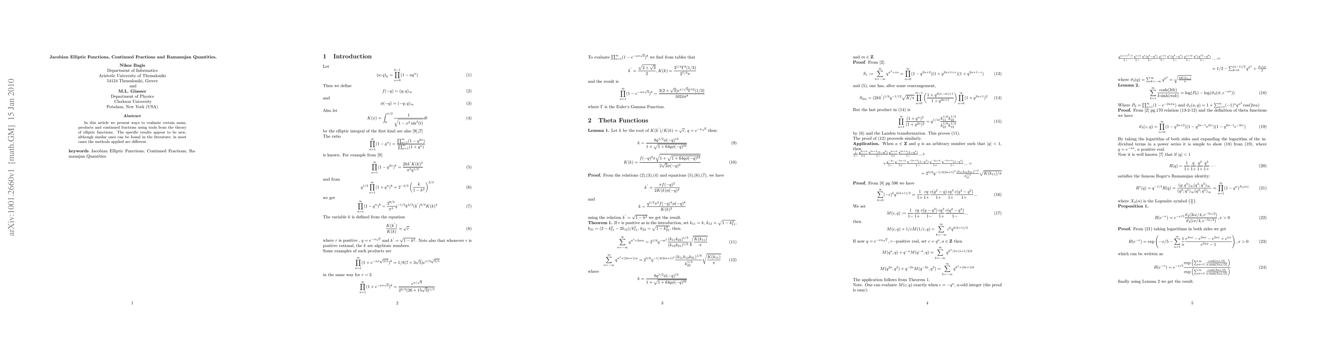 This paper explores the evaluation of sums, products, and continued fractions through the lens of Jacobian elliptic functions, presenting new results with distinct methods compared to existing literature. The focus is on leveraging elliptic functions to derive novel expressions for Ramanujan-like quantities.