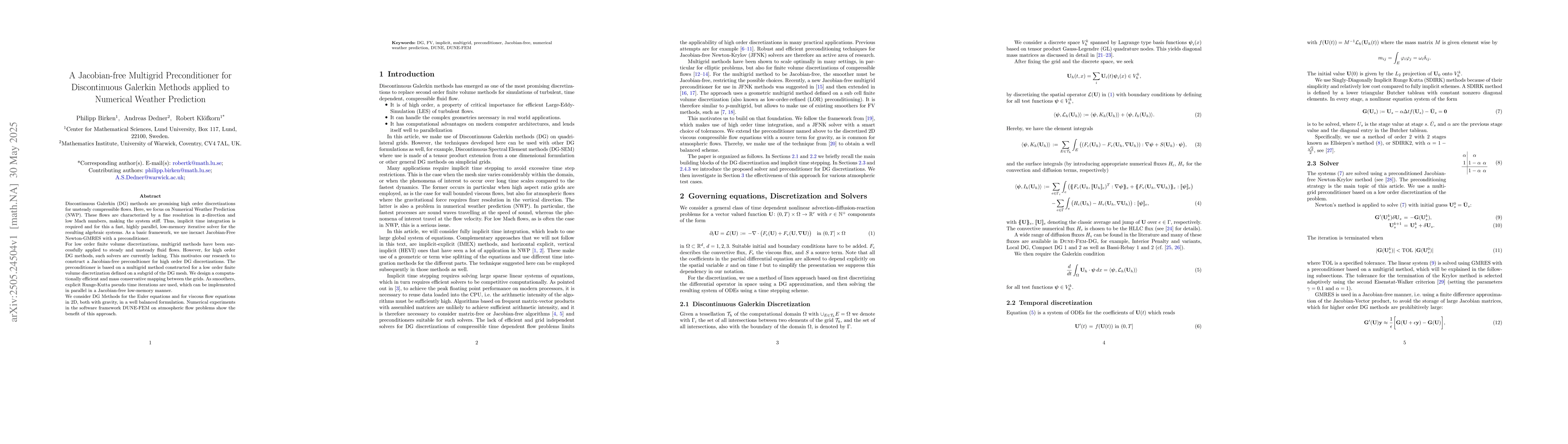 This research paper develops a Jacobian-free multigrid preconditioner for high-order Discontinuous Galerkin methods in Numerical Weather Prediction, improving efficiency and parallelizability for computational weather forecasting models.