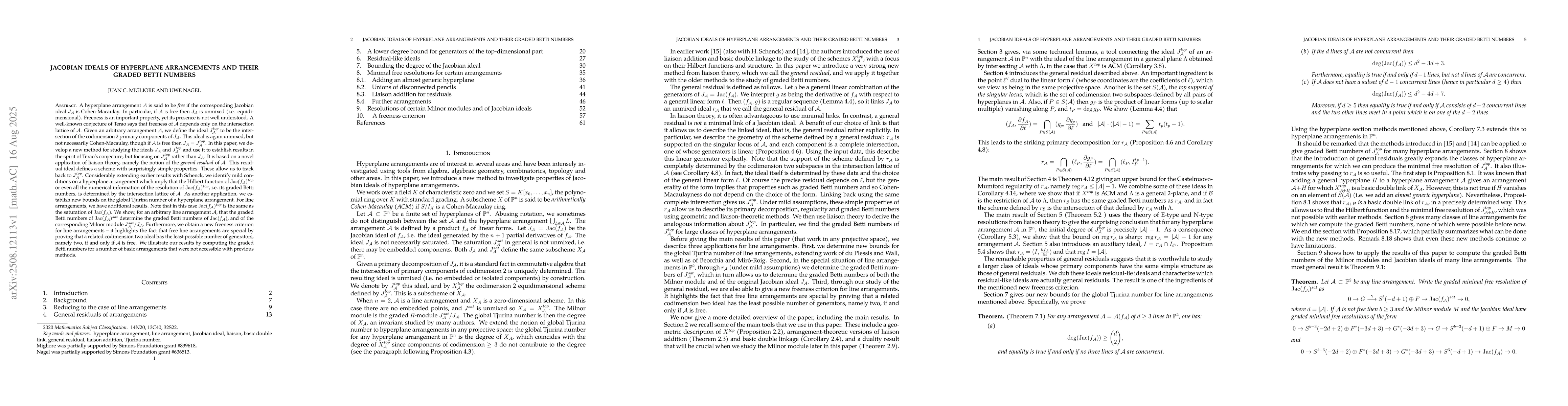 A hyperplane arrangement $\cA$ is said to be free if the corresponding Jacobian ideal $J_\cA$ is Cohen-Macaulay. If $\cA$ is free then $J_\cA$ is unmixed (i.e. equidimensional). Freeness is an important property, yet its presence is not well understood. A conjecture of Terao says that freeness of $\cA$ depends only on the intersection lattice of $\cA$. Given an arrangement $\cA$, we define the ideal $J_\cA^{top}$ to be the intersection of the codimension 2 primary components of $J_\cA$. This ideal is unmixed, but not necessarily Cohen-Macaulay; if $\cA$ is free then $J_\cA = J_\cA^{top}$. We develop a new method for studying the ideals $J_\cA$ and $J_\cA^{top}$ and establish results in the spirit of Terao's conjecture, focusing on $J_\cA^{top}$ rather than $J_\cA$. It is based on a new application of liaison theory, the general residual of $\cA$. This residual ideal defines a scheme with surprisingly simple properties. These allow us to track back to $J_\cA^{top}$. Extending earlier results with Schenck, we identify mild conditions on a hyperplane arrangement which imply that the Hilbert function of $\Jac( f_\cA)^{top}$ or even its graded Betti numbers, are determined by the intersection lattice of $\cA$. We establish new bounds on the global Tjurina number of a hyperplane arrangement. For line arrangements, we show that the graded Betti numbers of $\Jac( f_\cA)^{sat}$ determine the graded Betti numbers of $\Jac( f_\cA)$, and of the corresponding Milnor module $J_\cA^{sat}/J_\cA$. We obtain a new freeness criterion for line arrangements -- it highlights the fact that free line arrangements are special by proving that a related codimension two ideal has the least possible number of generators, namely two, if and only if $\cA$ is free. We illustrate our results by computing the graded Betti numbers for a number of basic arrangements that were not accessible with previous methods.